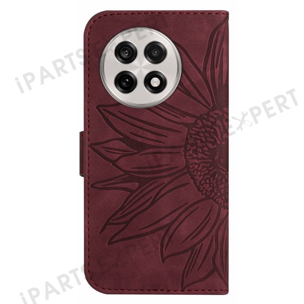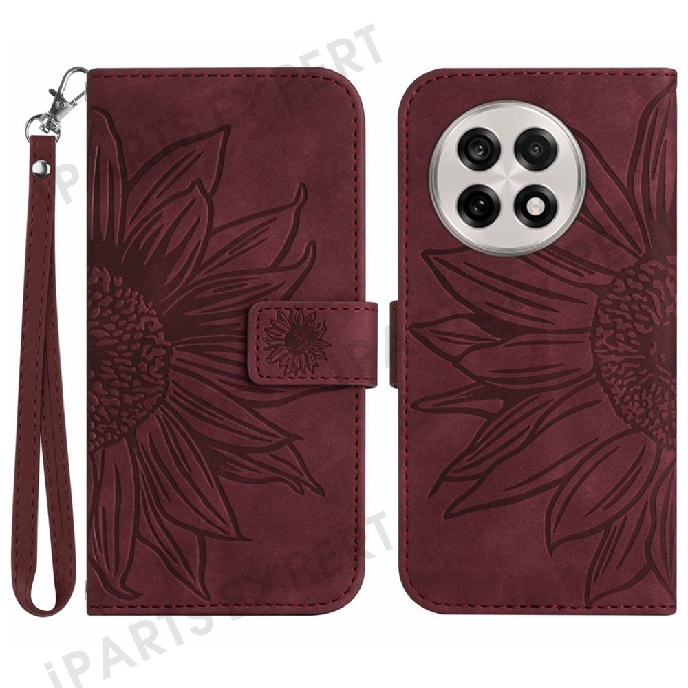 For OnePlus 13R 5G Case Sunflower Imprint Leather Wallet Phone Cover with Wrist Strap - Wine Red