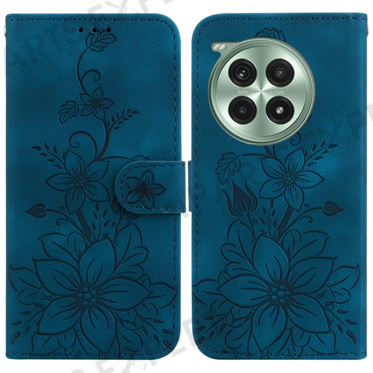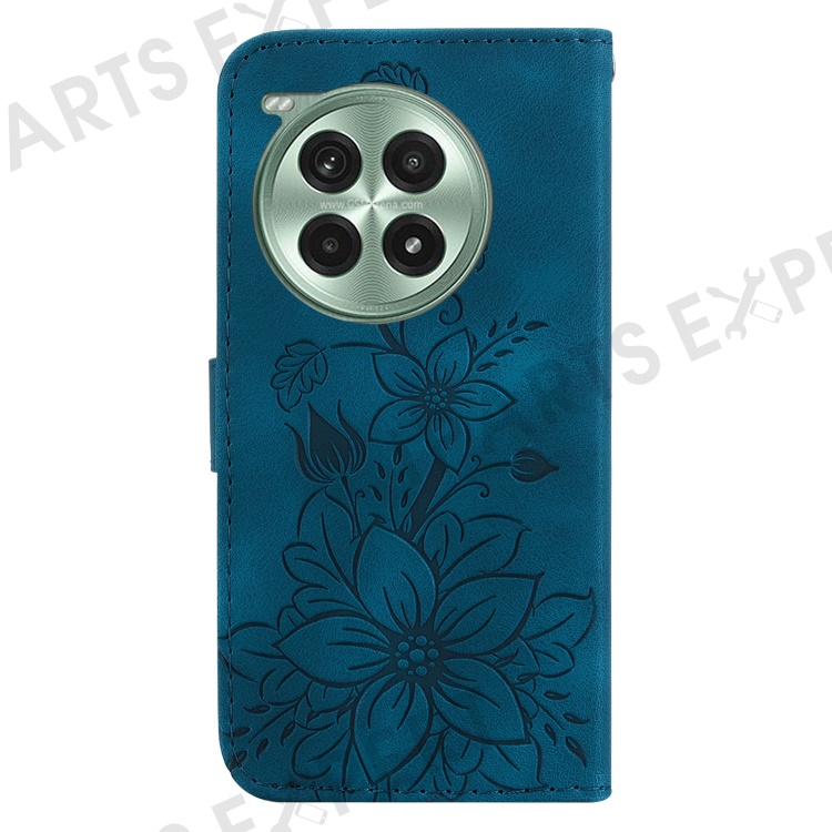 For OnePlus Ace 3 Pro 5G Stand Case Lily Flower Imprint Leather Phone Cover - Dark Blue