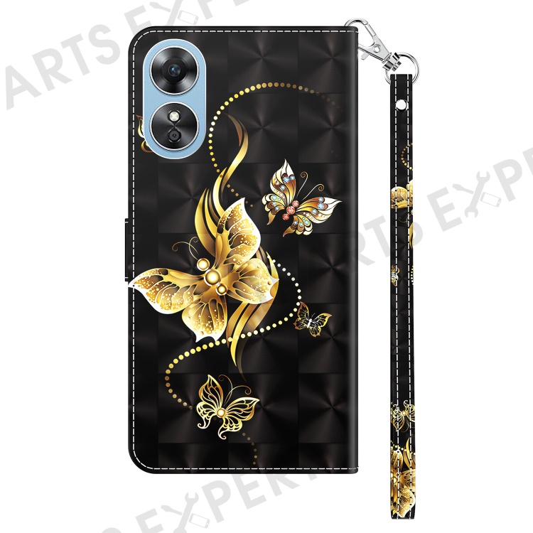 For Oppo A17 4G / A17k 4G Flip Phone Case, PU Leather 3D Pattern Printing Phone Cover Stand Wallet with Strap - Golden Butterfly