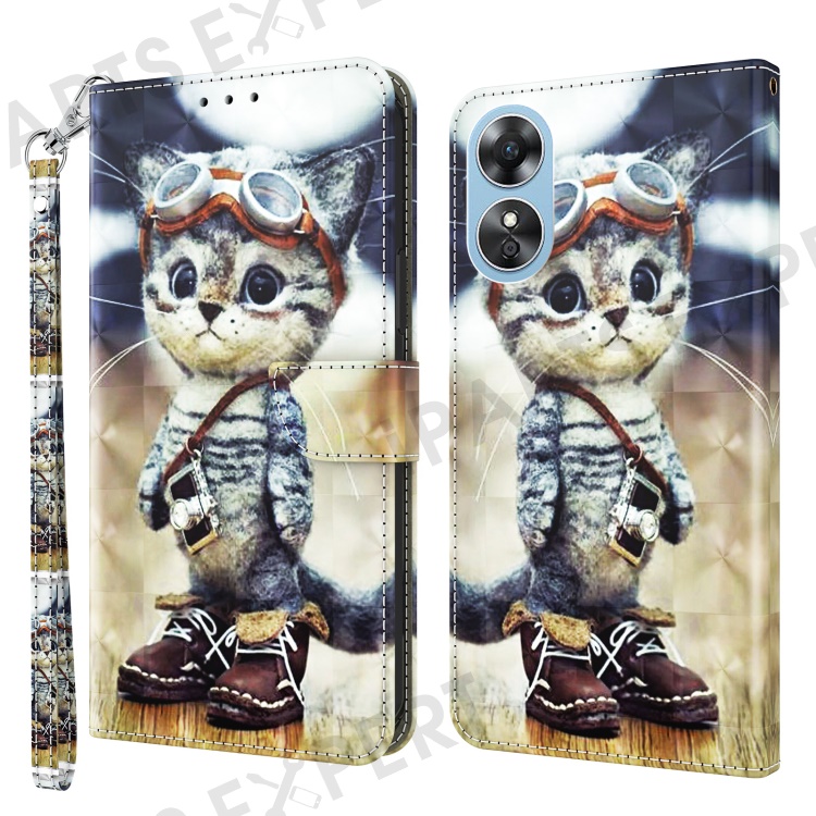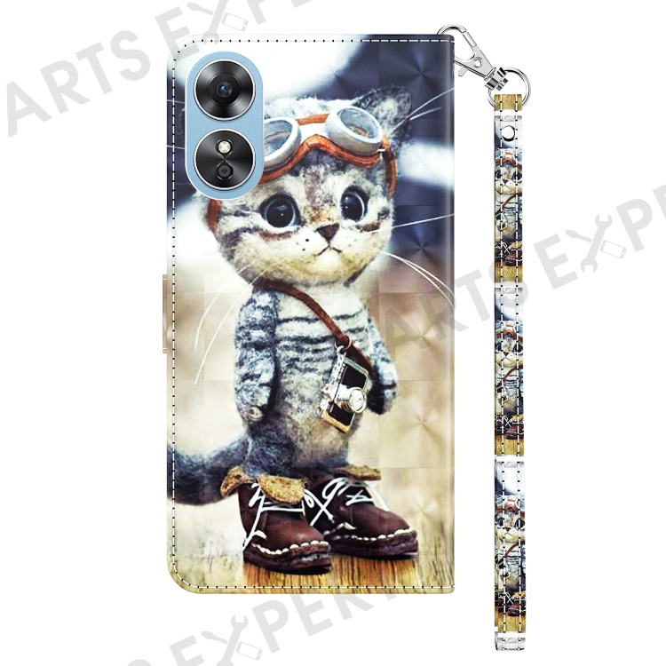 For Oppo A17 4G / A17k 4G Flip Phone Case, PU Leather 3D Pattern Printing Phone Cover Stand Wallet with Strap - Standing Cat