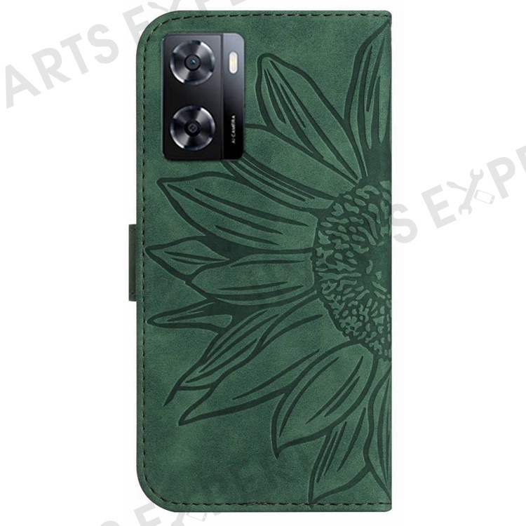 For Oppo A57 4G / A57s 4G / A57 (2022) 5G / A77 4G / A77 5G Skin-Touch Feeling Flip Phone Case, Imprinted Sunflower Stand PU Leather Magnetic Wallet Cover with Strap - Dark Green