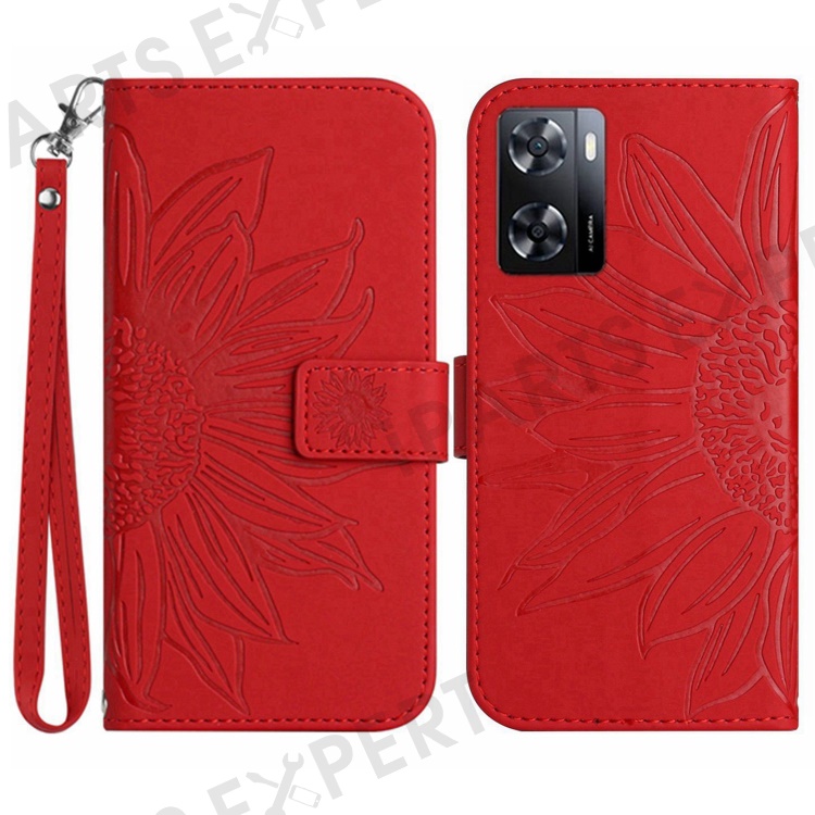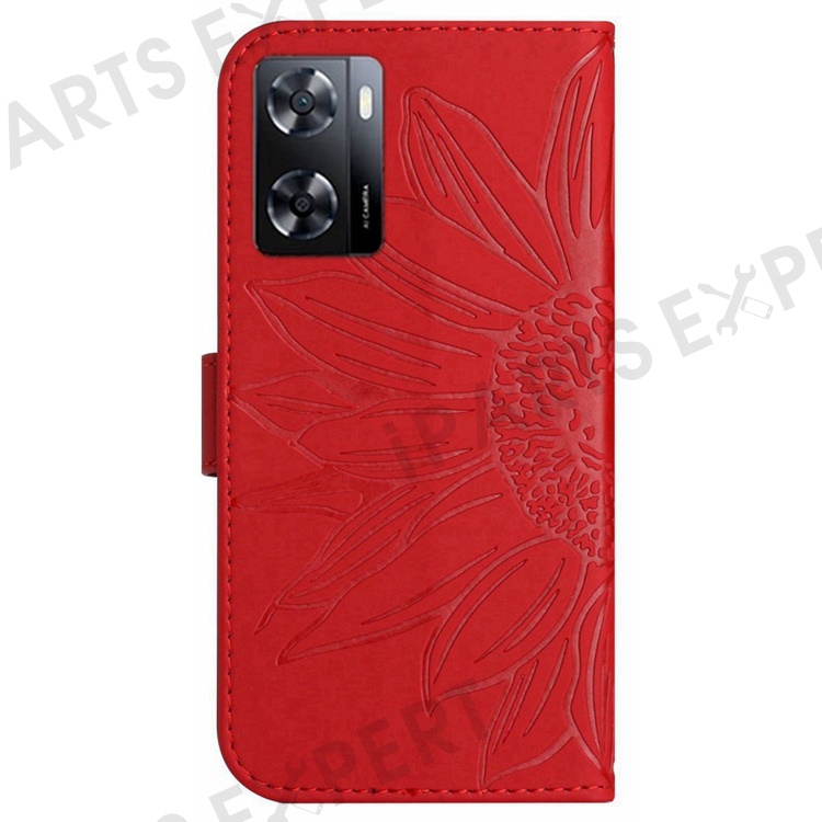 For Oppo A57 4G / A57s 4G / A57 (2022) 5G / A77 4G / A77 5G Skin-Touch Feeling Flip Phone Case, Imprinted Sunflower Stand PU Leather Magnetic Wallet Cover with Strap - Red