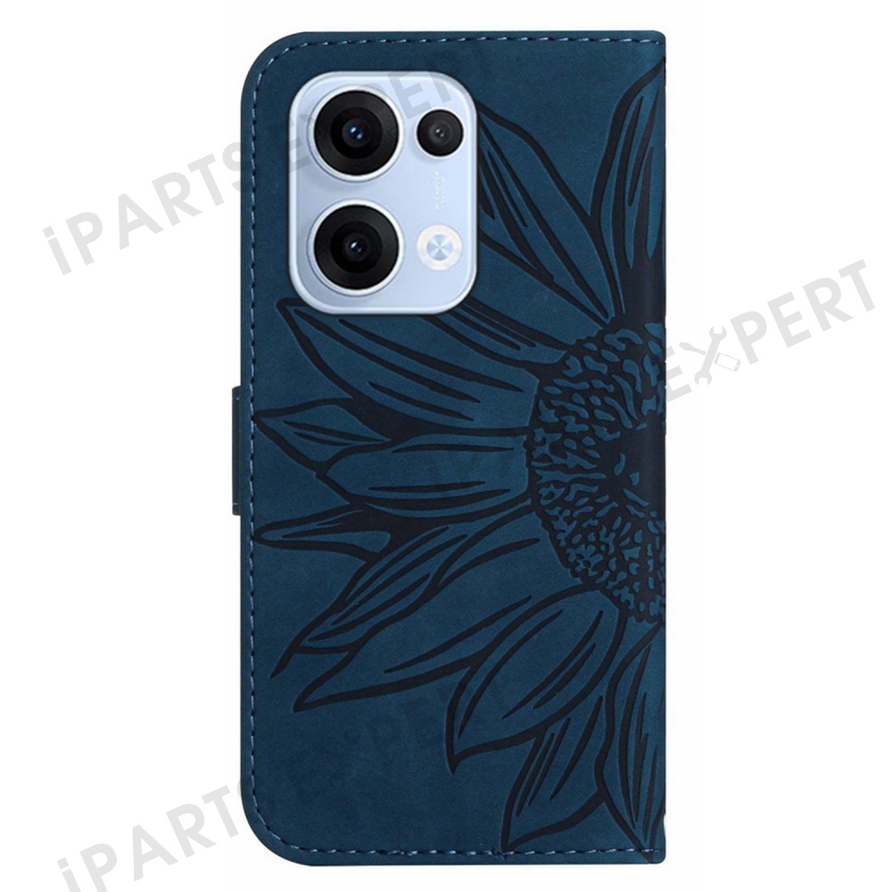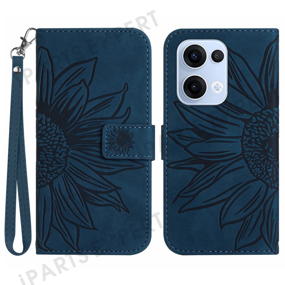 For Oppo Reno13 5G (Global) Case Sunflower Imprint Leather Wallet Phone Cover with Wrist Strap - Dark Blue
