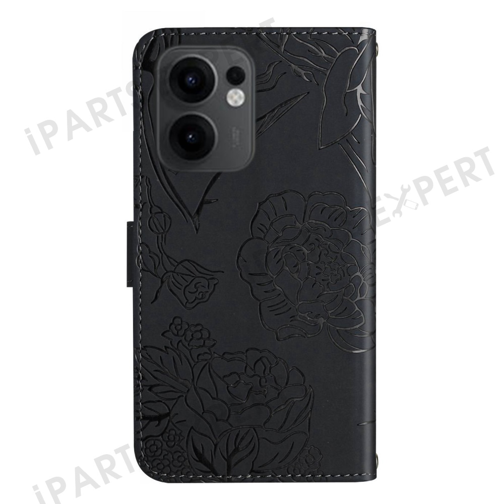 For Oppo Reno13 F 5G (Reno 13 FS 5G) / 4G Case Butterfly Flower Imprint Leather Phone Cover with Shoulder Strap - Black
