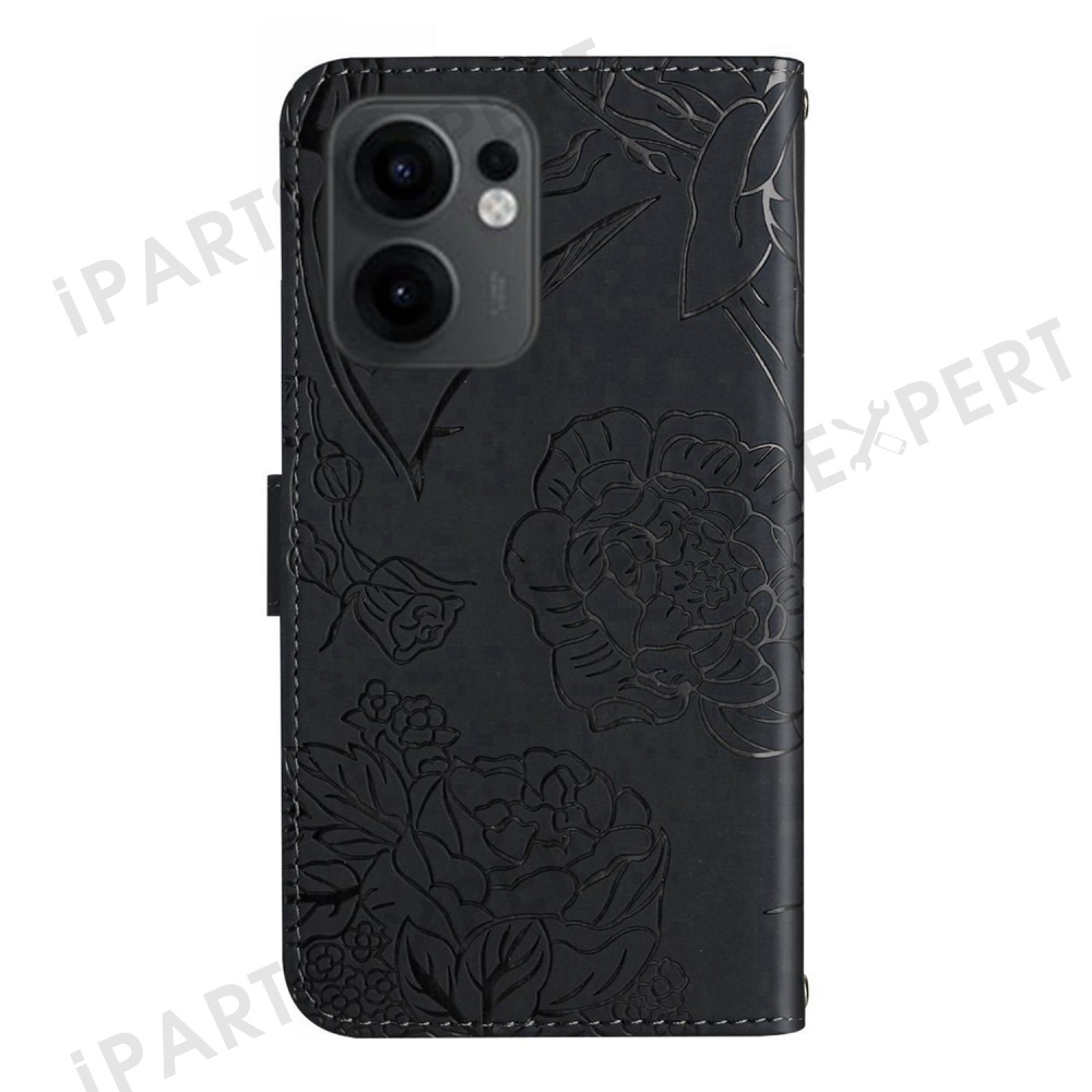 For Oppo Reno13 F 5G (Reno 13 FS 5G) / 4G Case Butterfly Flower Imprinted Leather Phone Cover with Strap - Black