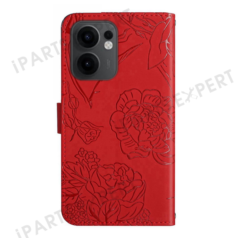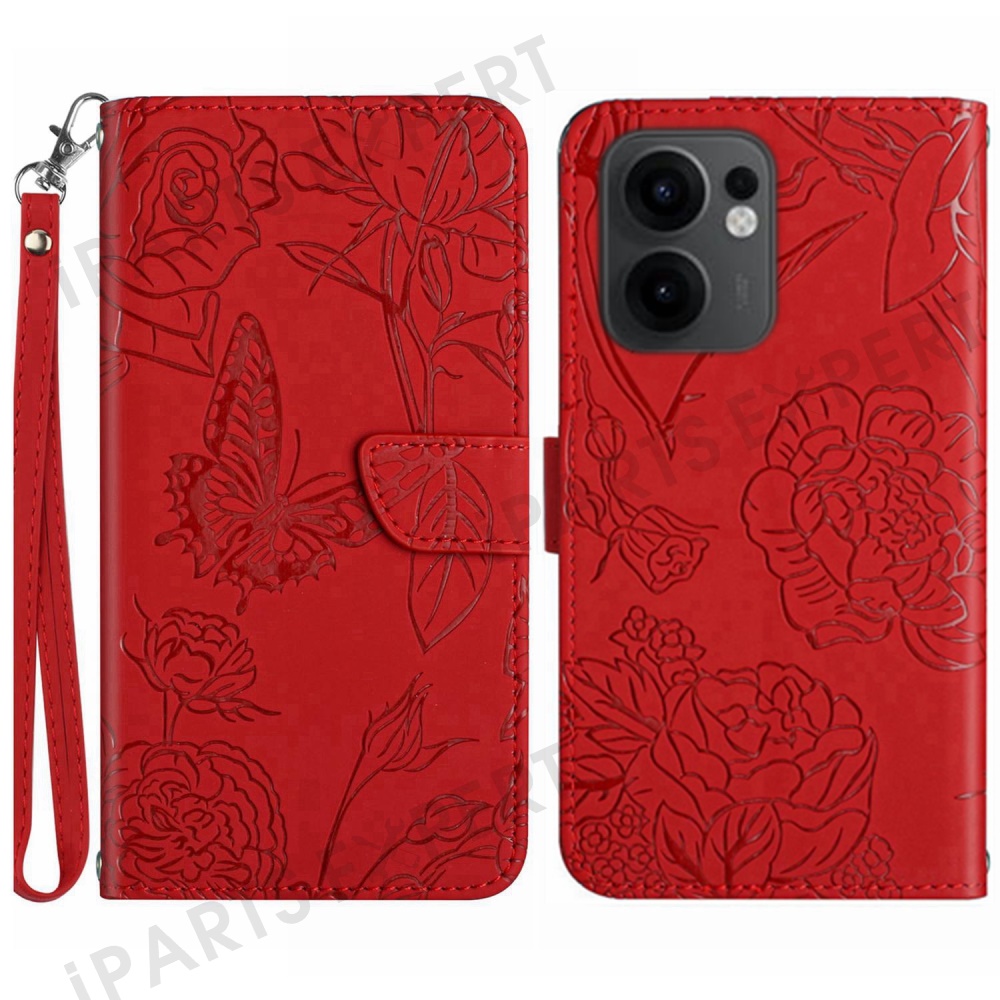 For Oppo Reno13 F 5G (Reno 13 FS 5G) / 4G Case Butterfly Flower Imprinted Leather Phone Cover with Strap - Red