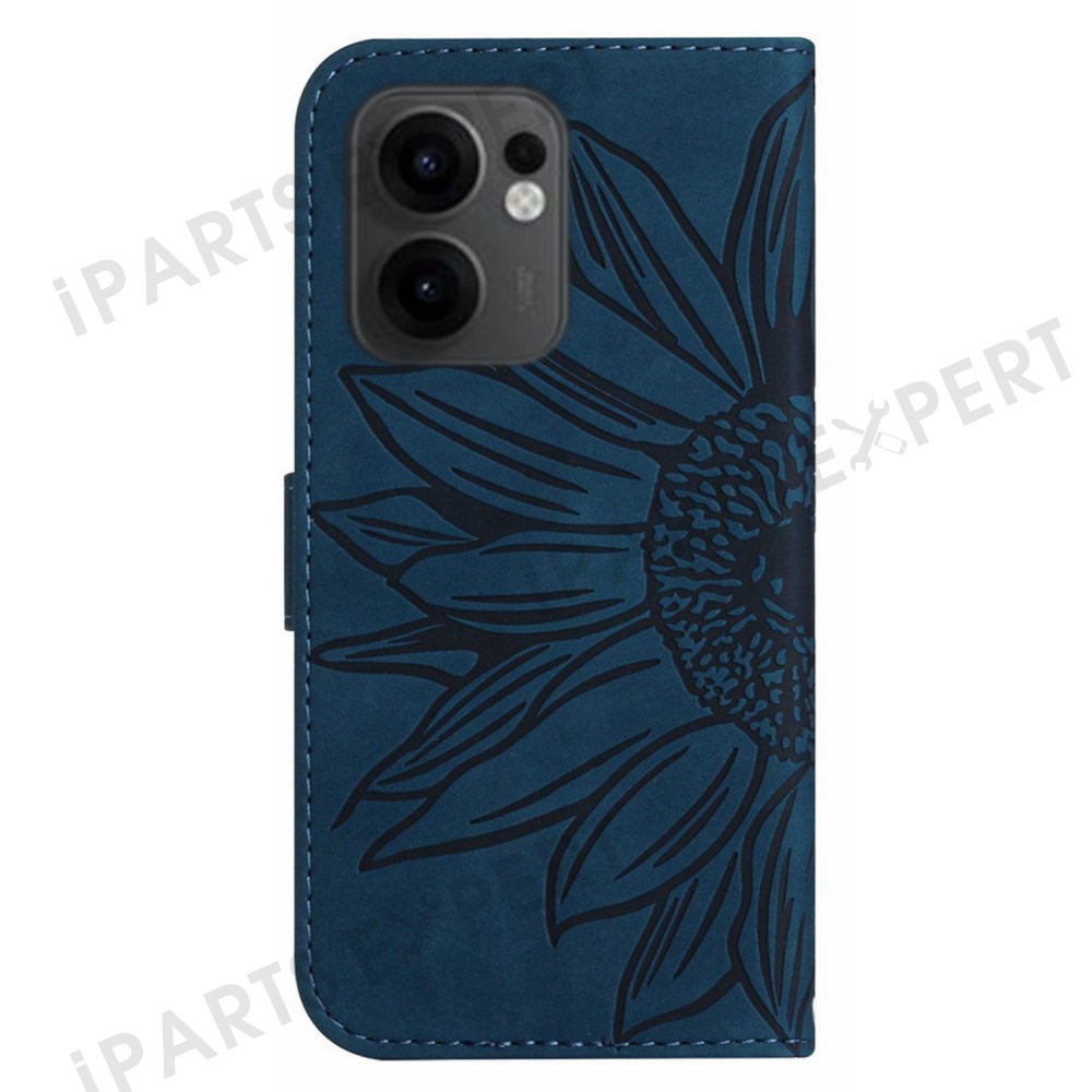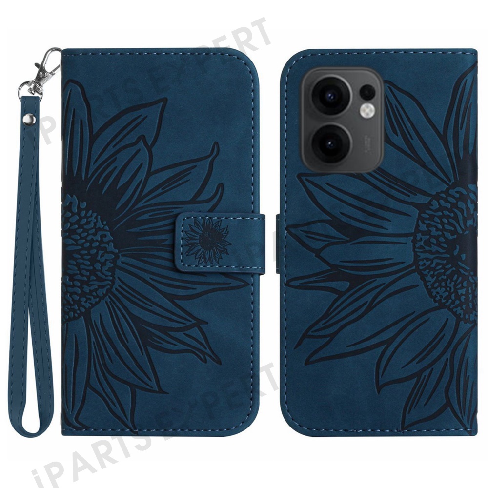 For Oppo Reno13 F 5G (Reno 13 FS 5G) / 4G Case Sunflower Imprint Leather Wallet Phone Cover with Wrist Strap - Dark Blue