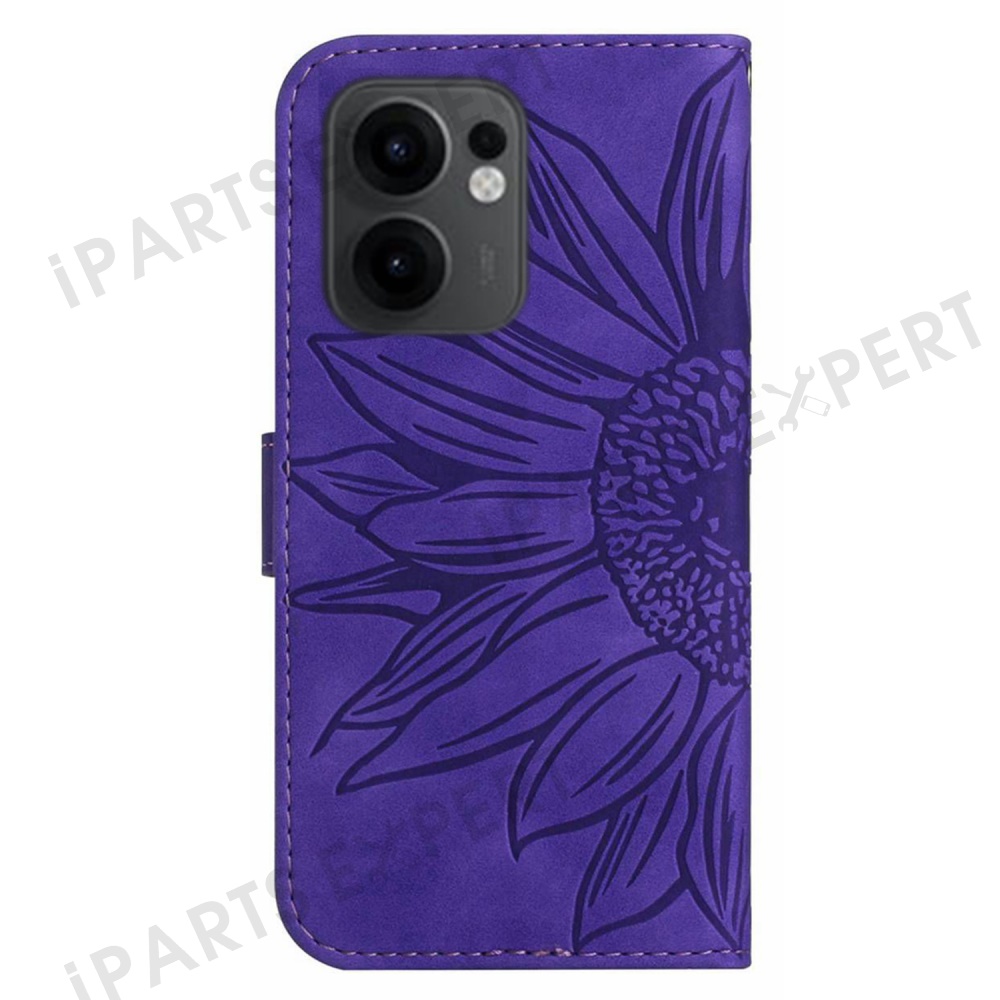 For Oppo Reno13 F 5G (Reno 13 FS 5G) / 4G Case Sunflower Imprint Leather Wallet Phone Cover with Wrist Strap - Dark Purple