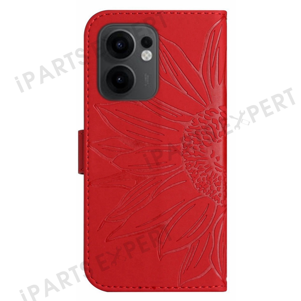 For Oppo Reno13 F 5G (Reno 13 FS 5G) / 4G Case Sunflower Imprint Leather Wallet Phone Cover with Wrist Strap - Red