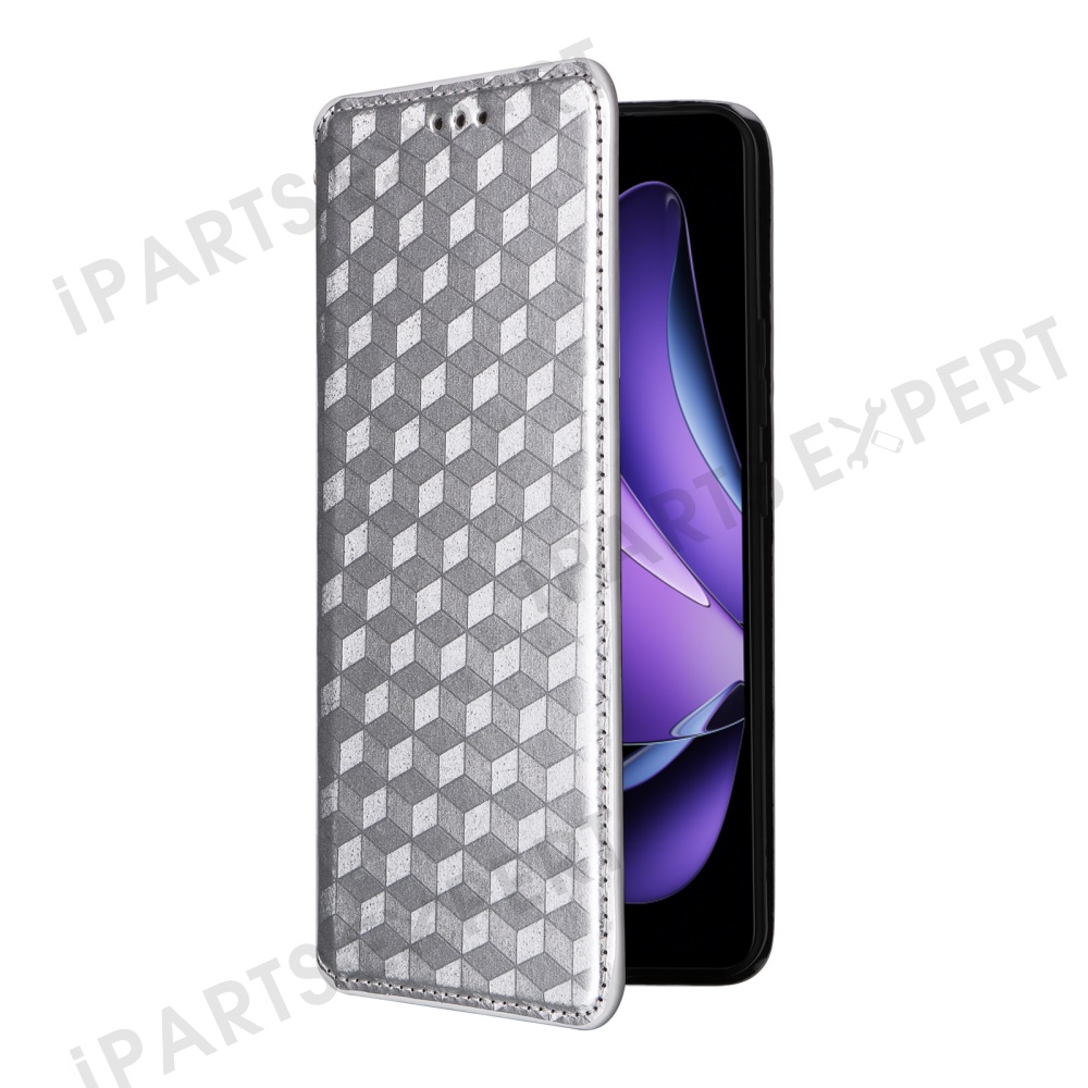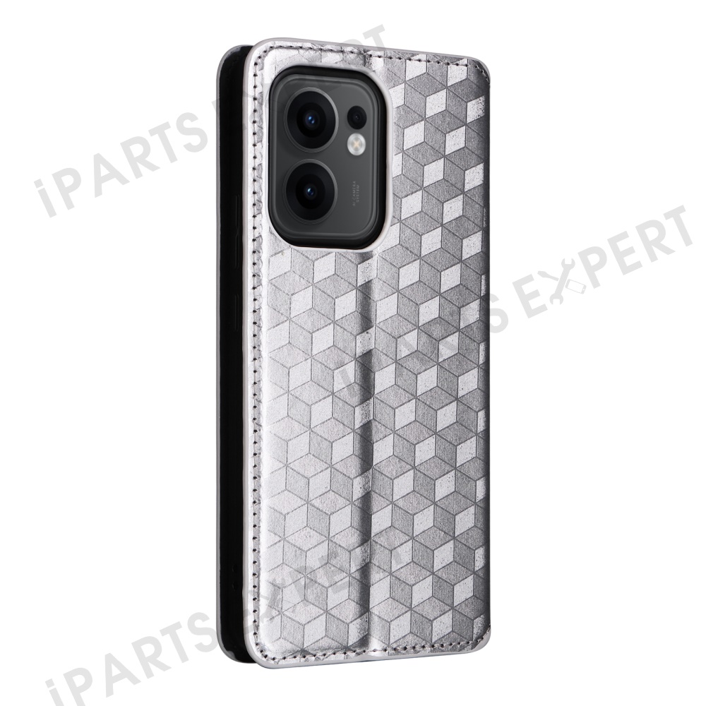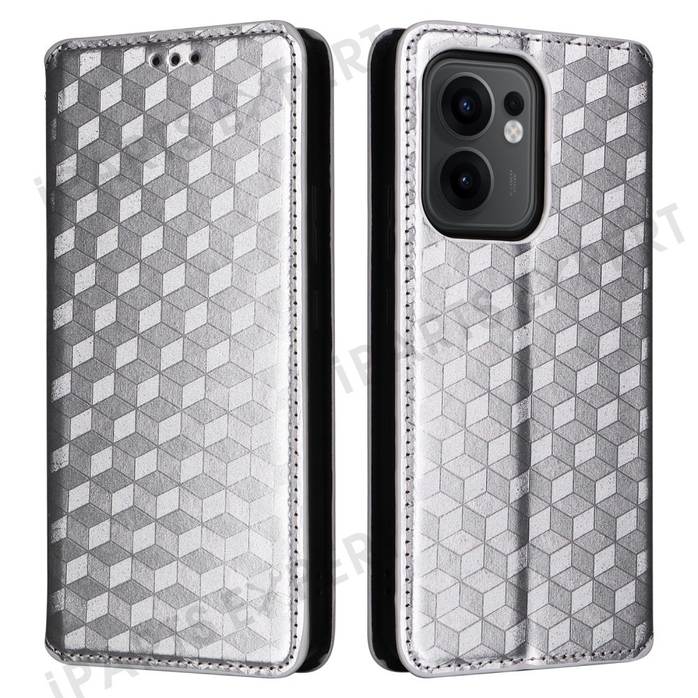 For Oppo Reno13 F 5G (Reno 13 FS 5G) / 4G Wallet Case Rhombus Imprinted Leather Phone Cover - Silver