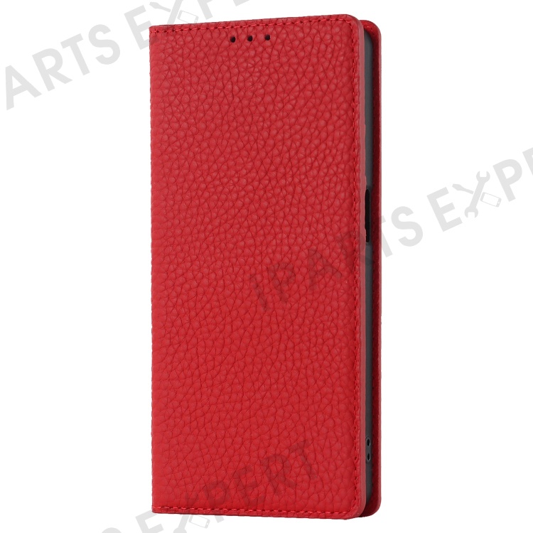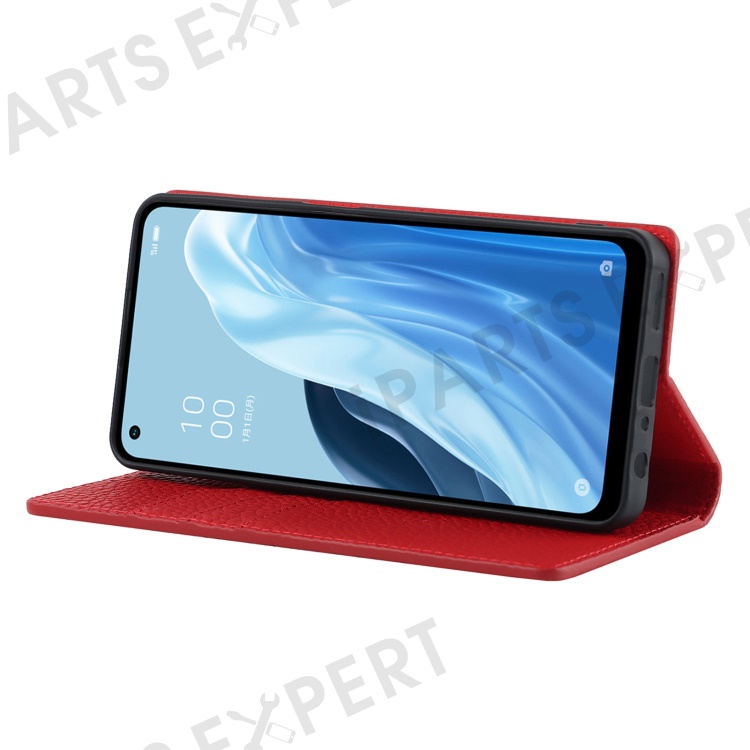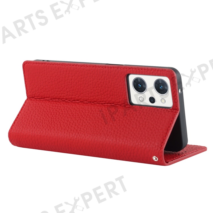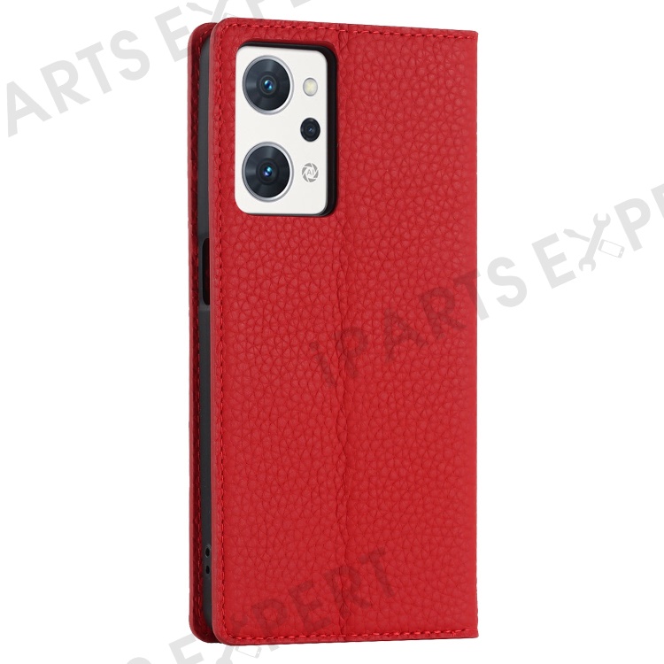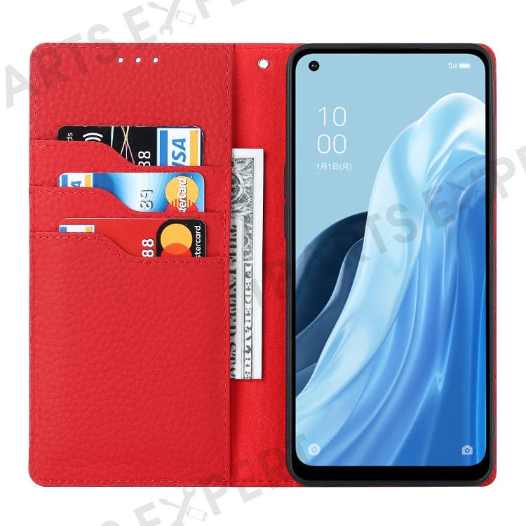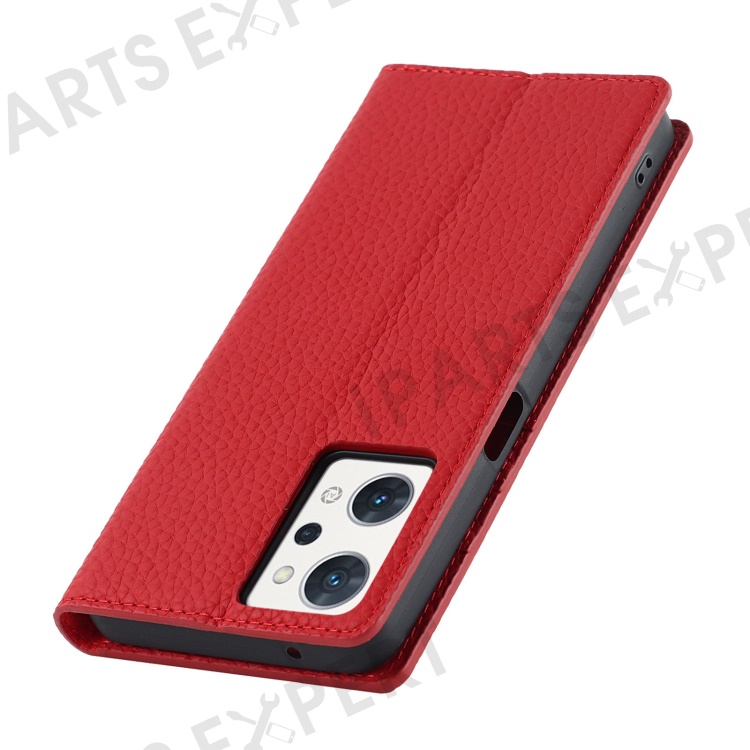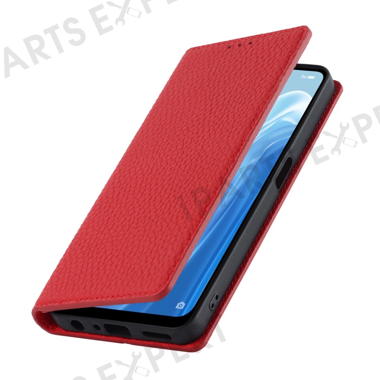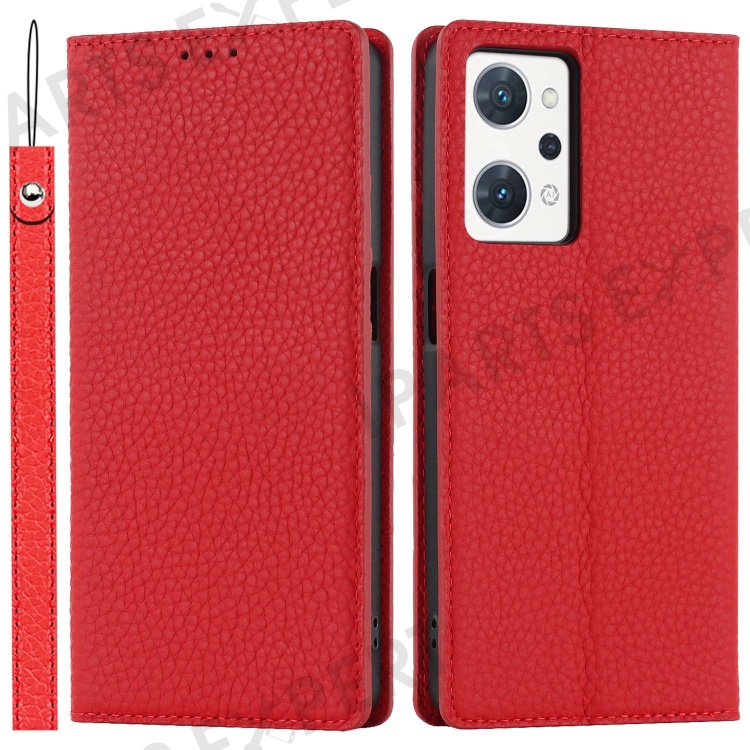For Oppo Reno7 A (Japan Version) 5G Litchi Texture Genuine Leather Case Folio Flip Wallet Stand Phone Protective Cover with Hand Strap - Red