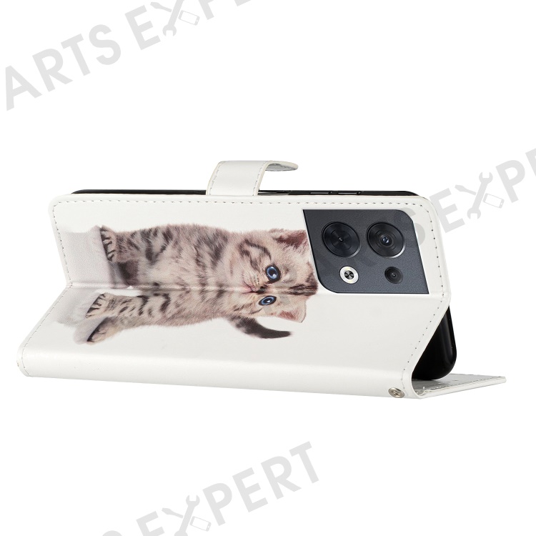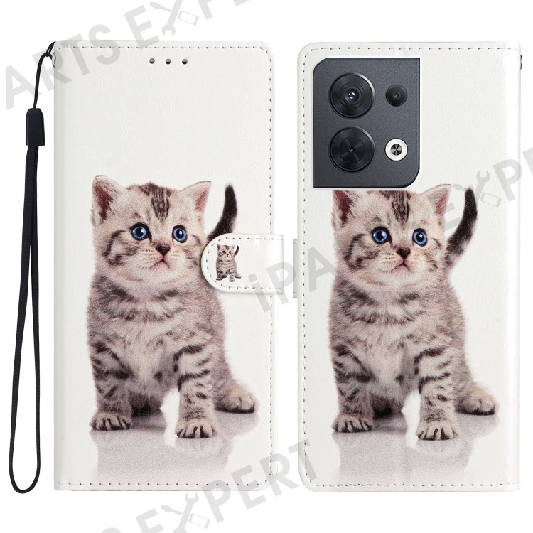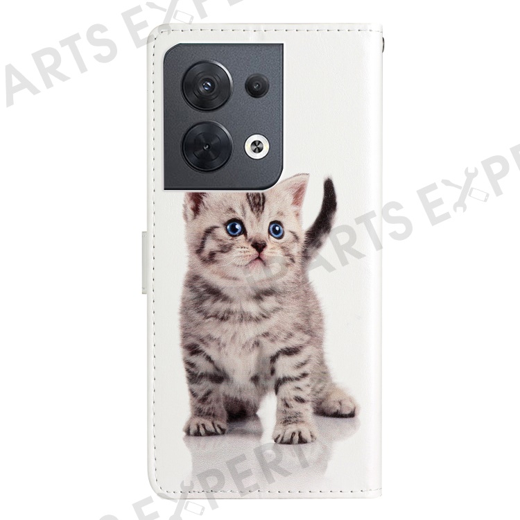 For Oppo Reno8 5G (Global Version) Pattern Printing PU Leather Flip Cover Stand Feature Magnetic Closure Wallet Phone Case with Strap - Cute Cat