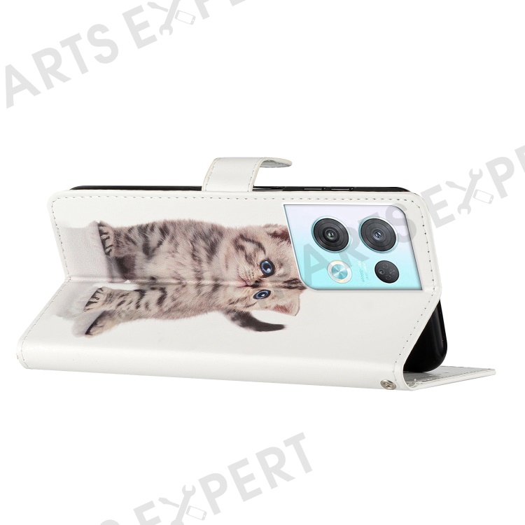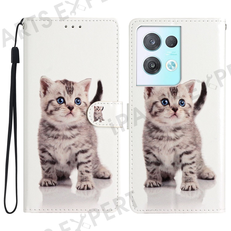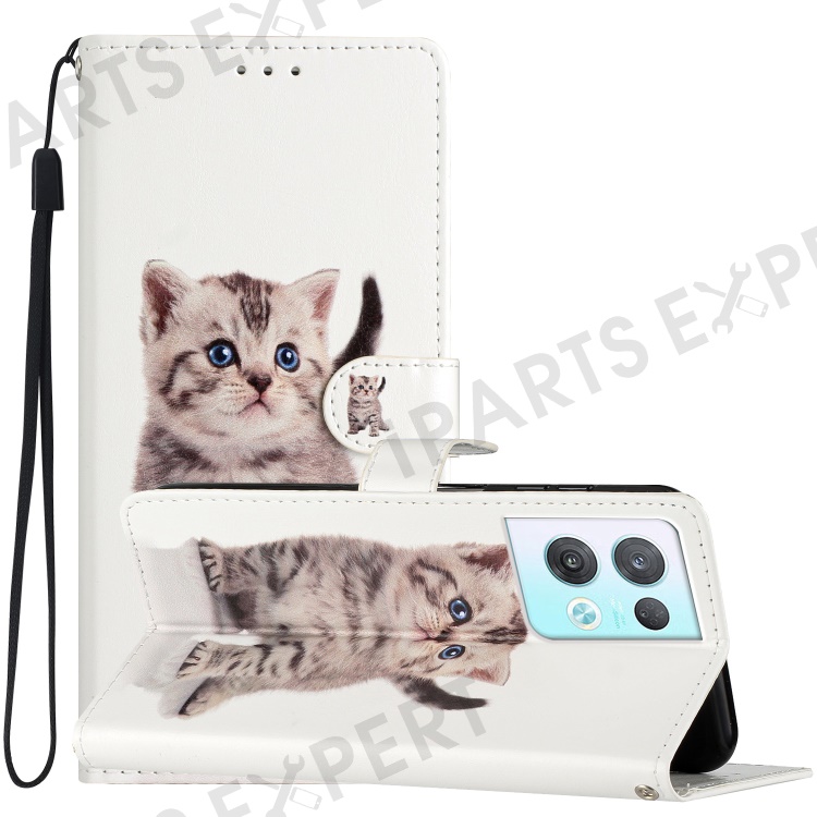 For Oppo Reno8 Pro 5G (Global Version) PU Leather Book Stand Cover Pattern Printing Magnetic Closure Wallet Style Flip Phone Case with Strap - Cute Cat