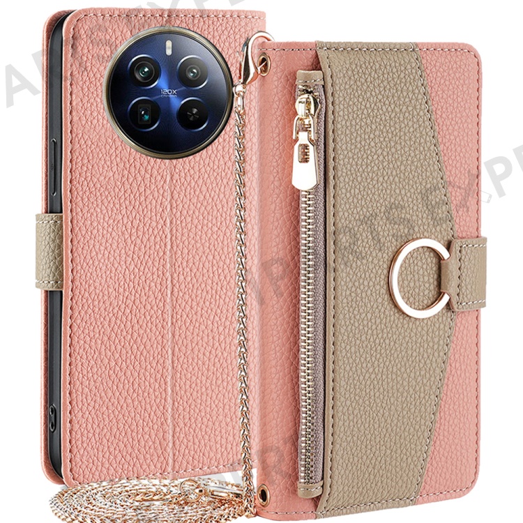 For Realme 12 Pro 5G / 12 Pro+ 5G Case with Lanyard Wallet Zipper Leather Phone Cover - Pink