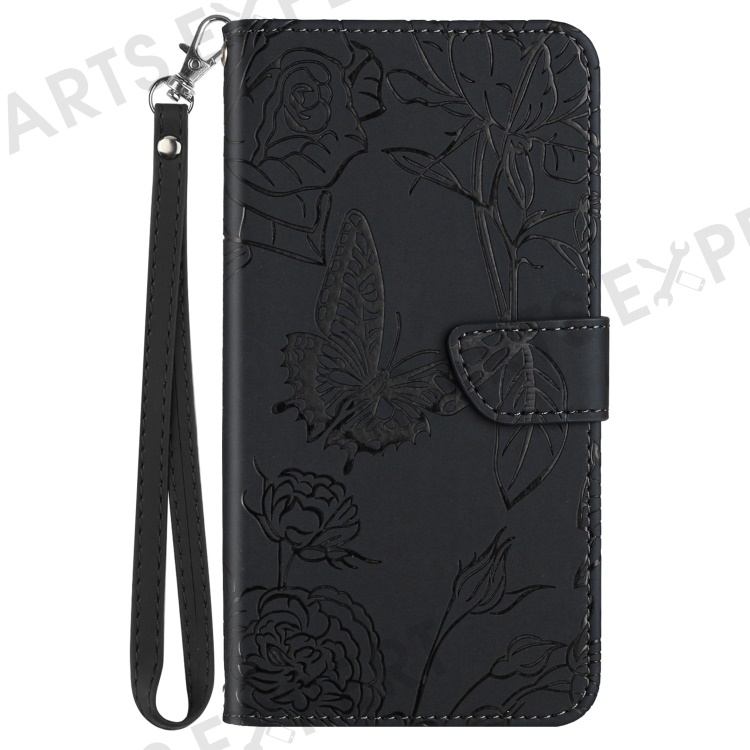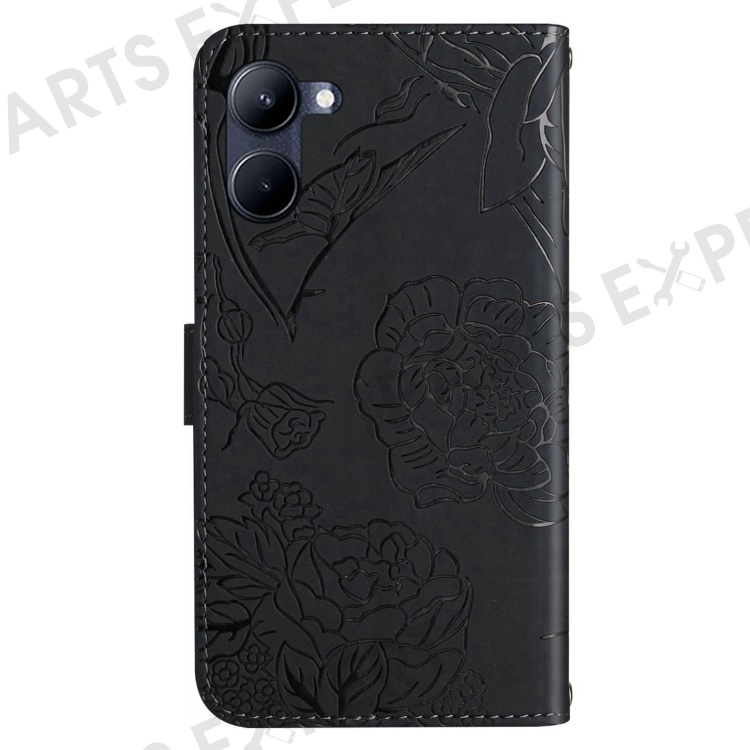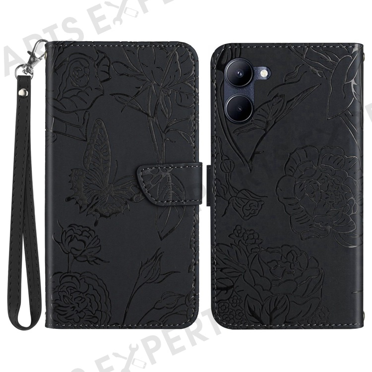 For Realme C33 2023 4G / C33 4G HT03 Imprinted Butterfly Flowers Anti-fall Phone Case Skin-touch PU Leather Magnetic Wallet Flip Cover Foldable Stand with Strap - Black