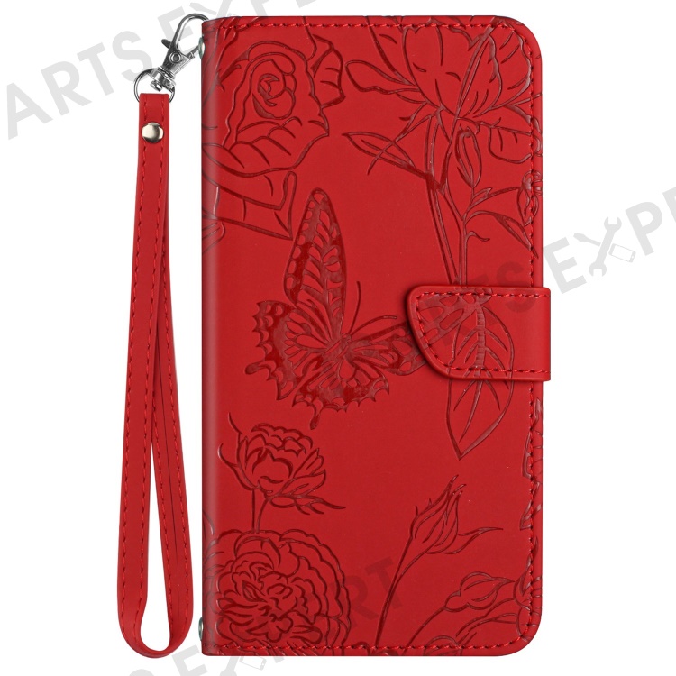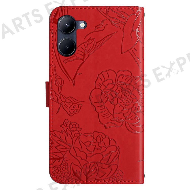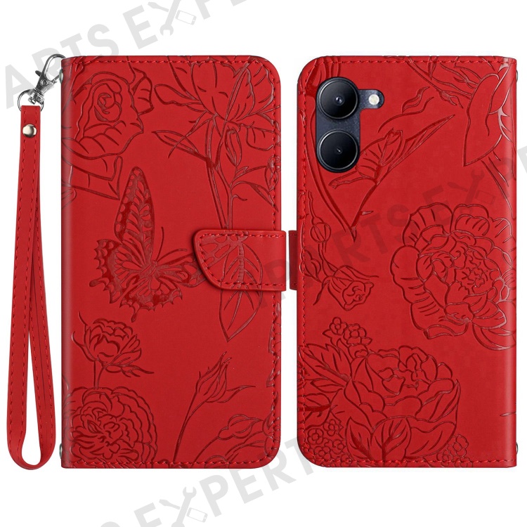 For Realme C33 2023 4G / C33 4G HT03 Imprinted Butterfly Flowers Anti-fall Phone Case Skin-touch PU Leather Magnetic Wallet Flip Cover Foldable Stand with Strap - Red