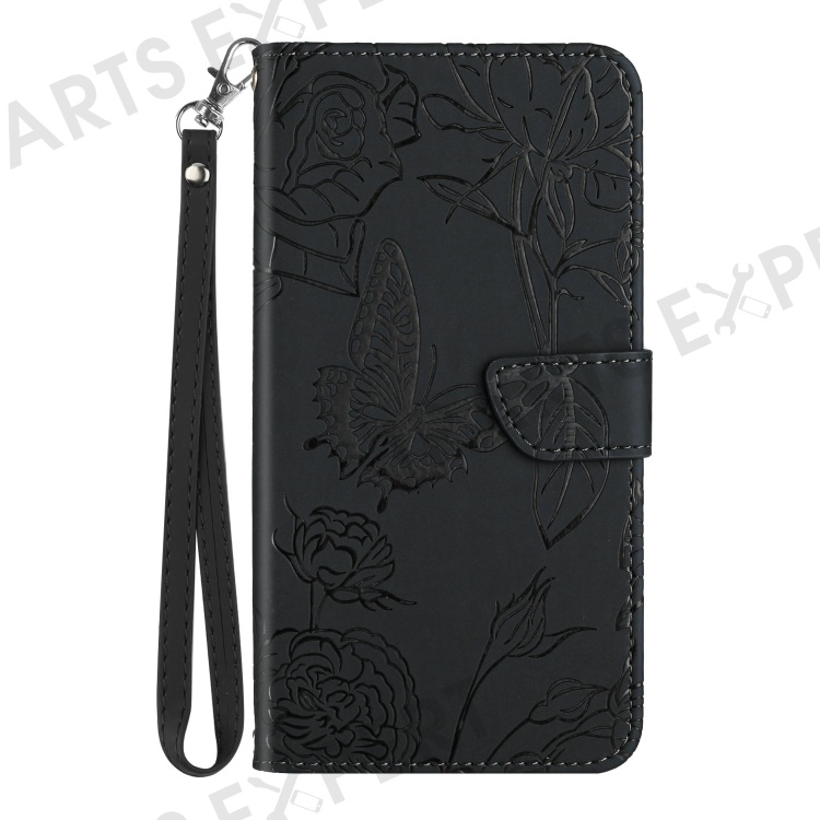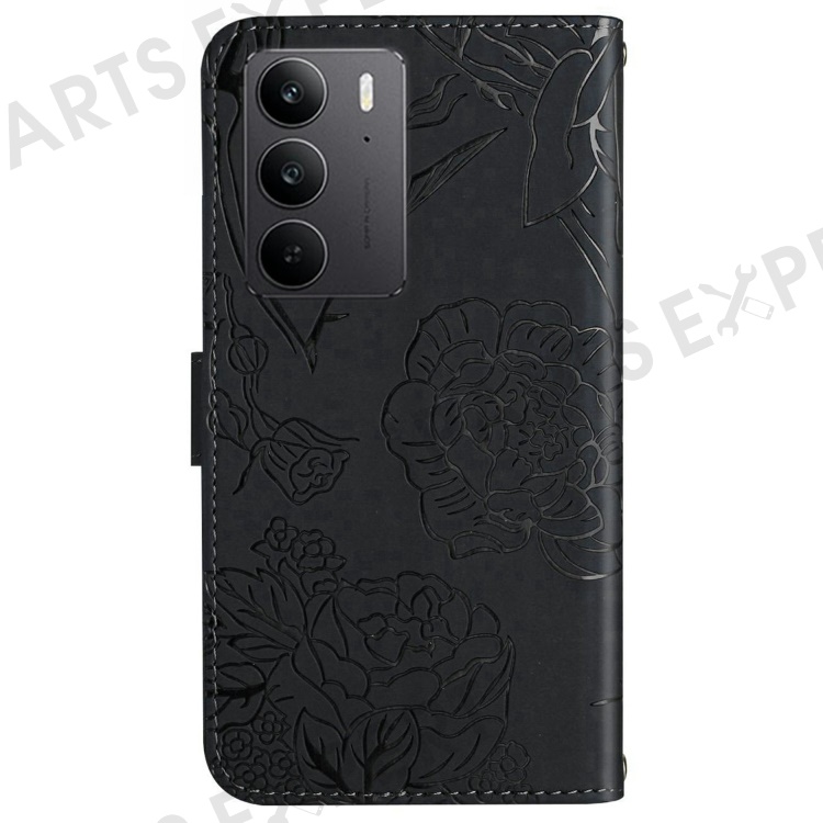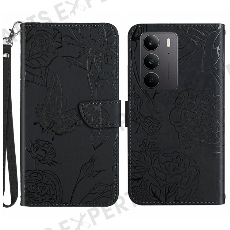 For Realme C75 4G Case Leather Phone Cover with Strap, Butterfly Flower Imprint - Black