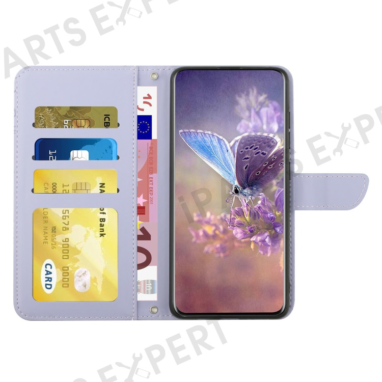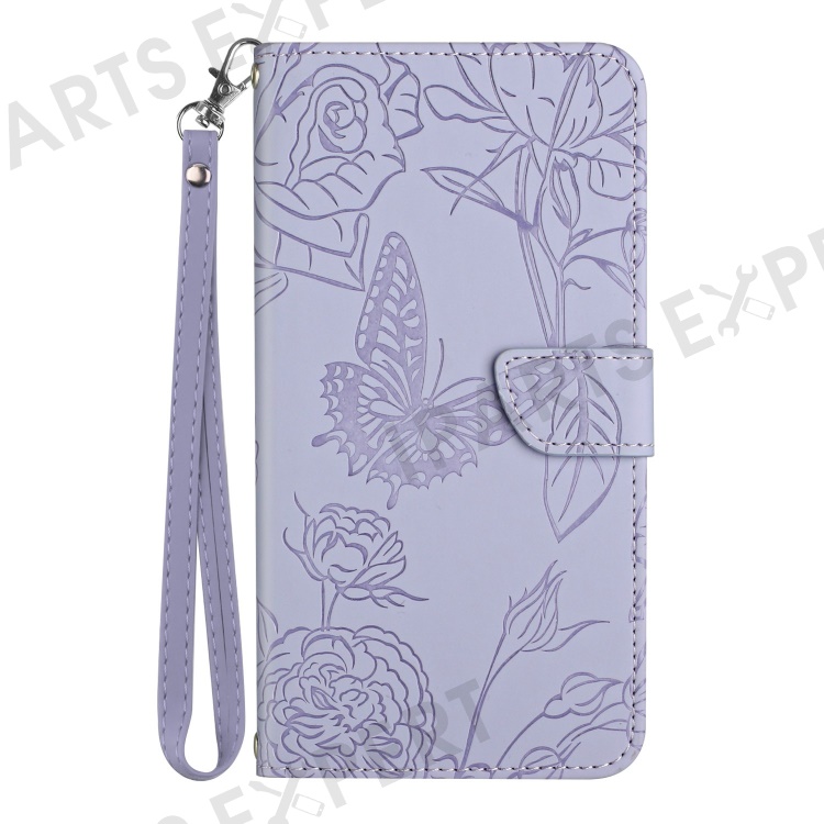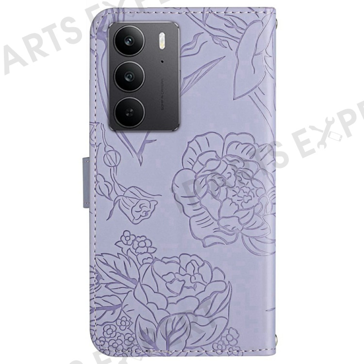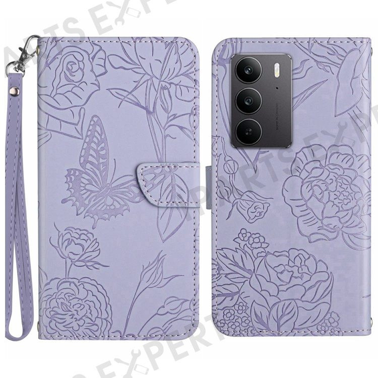 For Realme C75 4G Case Leather Phone Cover with Strap, Butterfly Flower Imprint - Purple