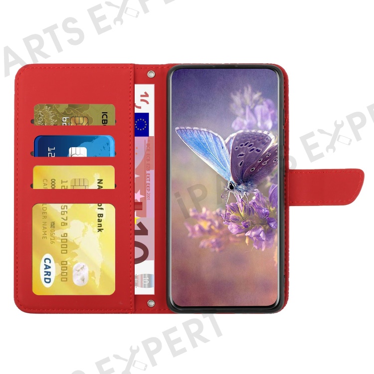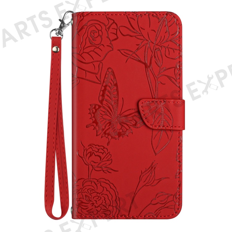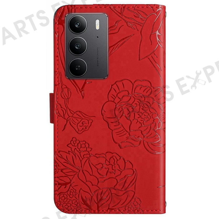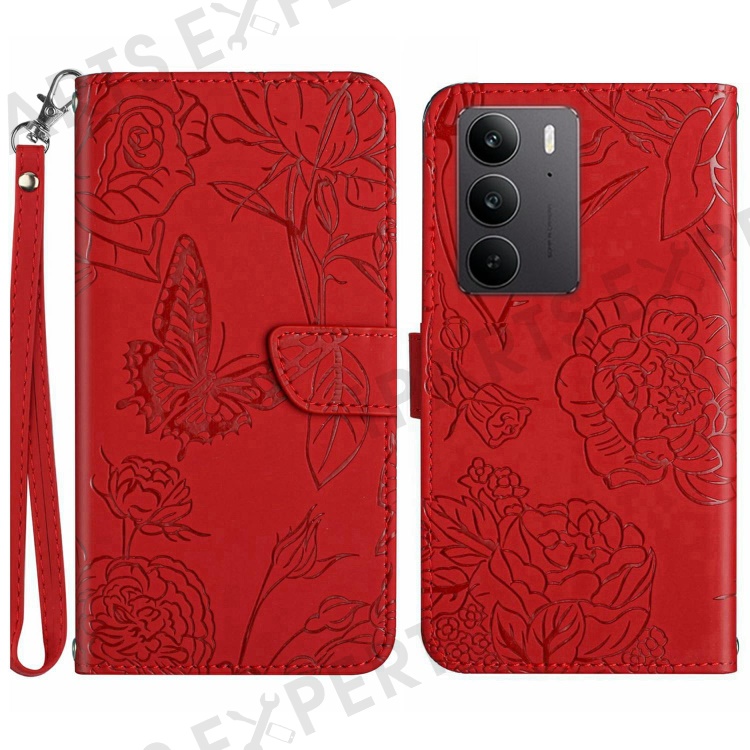 For Realme C75 4G Case Leather Phone Cover with Strap, Butterfly Flower Imprint - Red