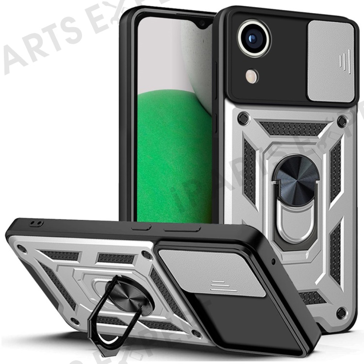 For Samsung Galaxy A03 Core PC + TPU Anti-Scratch Armour Phone Cover Ring Holder Kickstand Protective Case with Camera Slide Cover - Silver