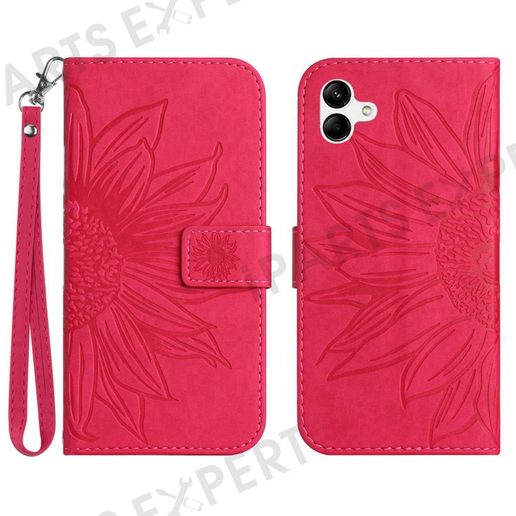 For Samsung Galaxy A04 4G (164.4 x 76.3 x 9.1 mm) HT04 Fall Protection Skin-Touch PU Leather Phone Case Imprinted Sunflower Stand Wallet Cover with Hand Strap - Rose