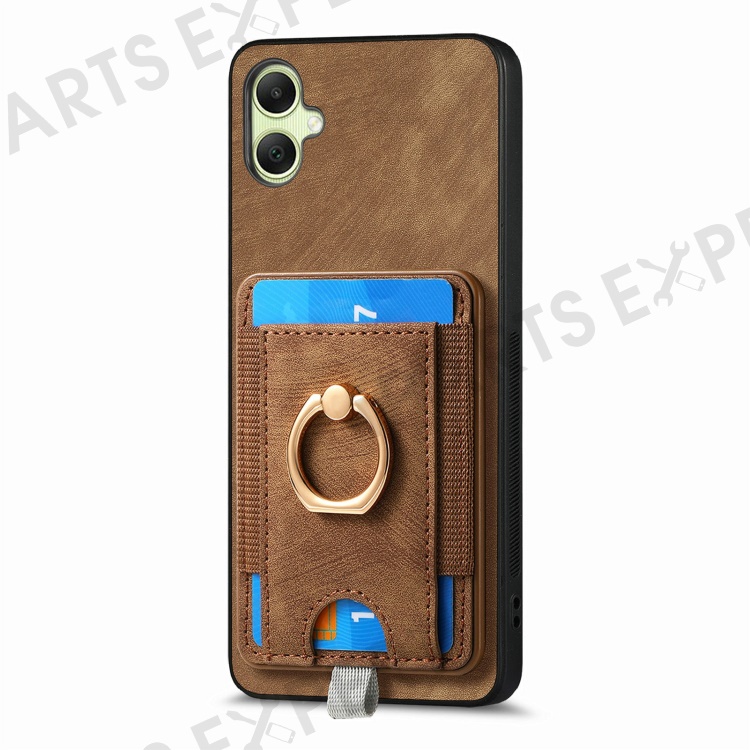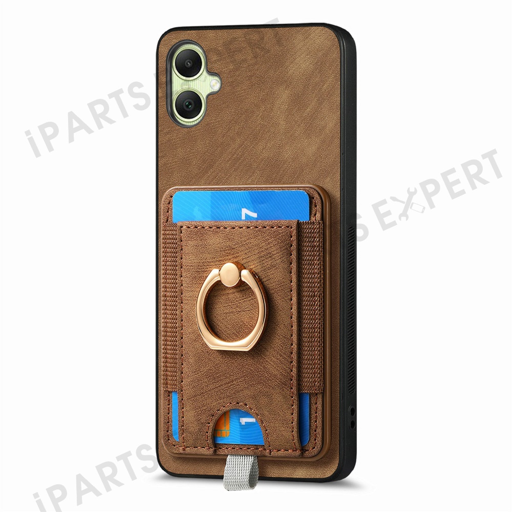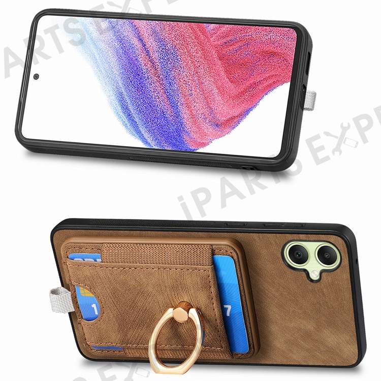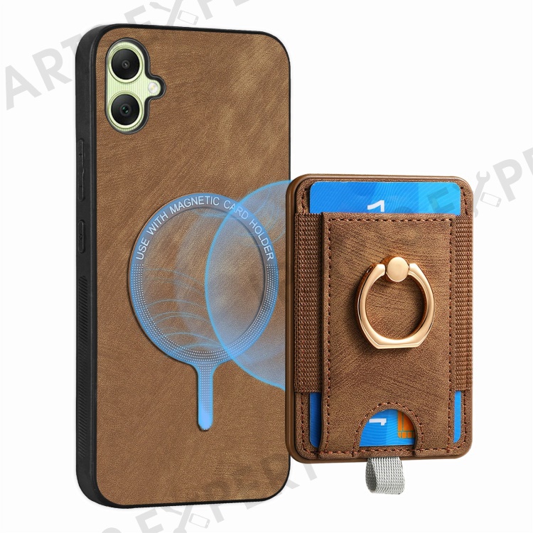For Samsung Galaxy A06 4G Magnetic Case Card Holder Ring Kickstand PU Leather Phone Back Cover - Brown