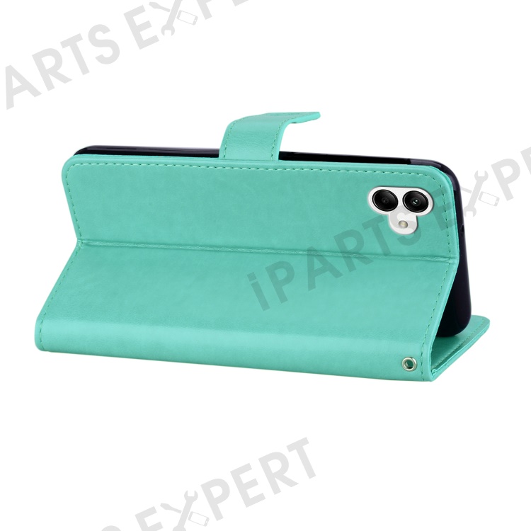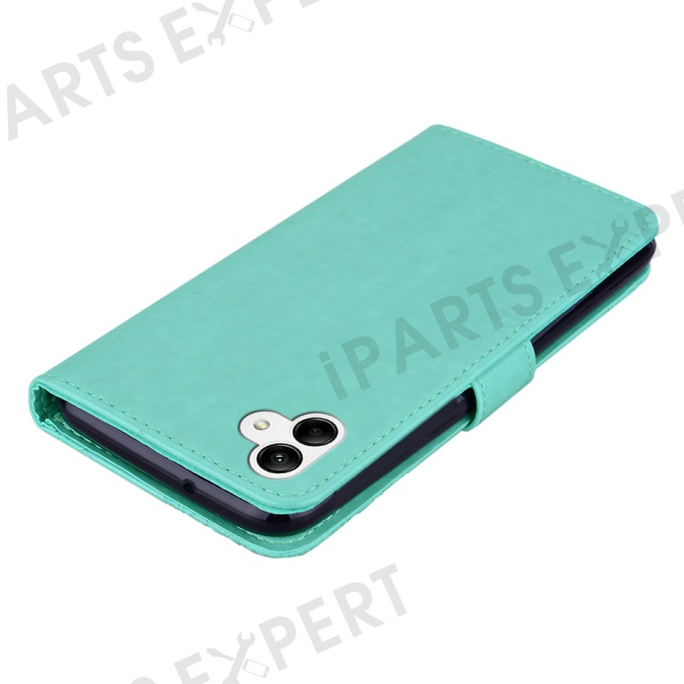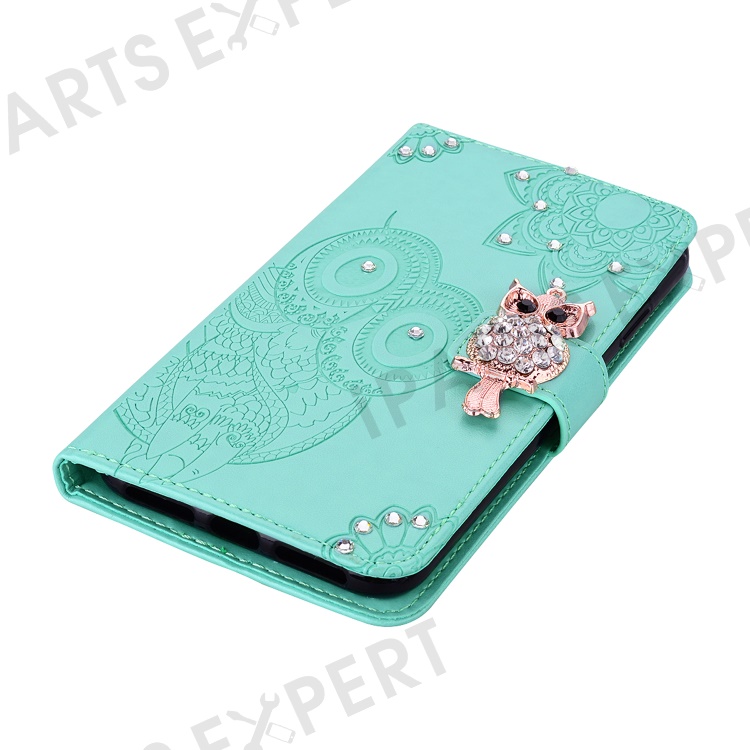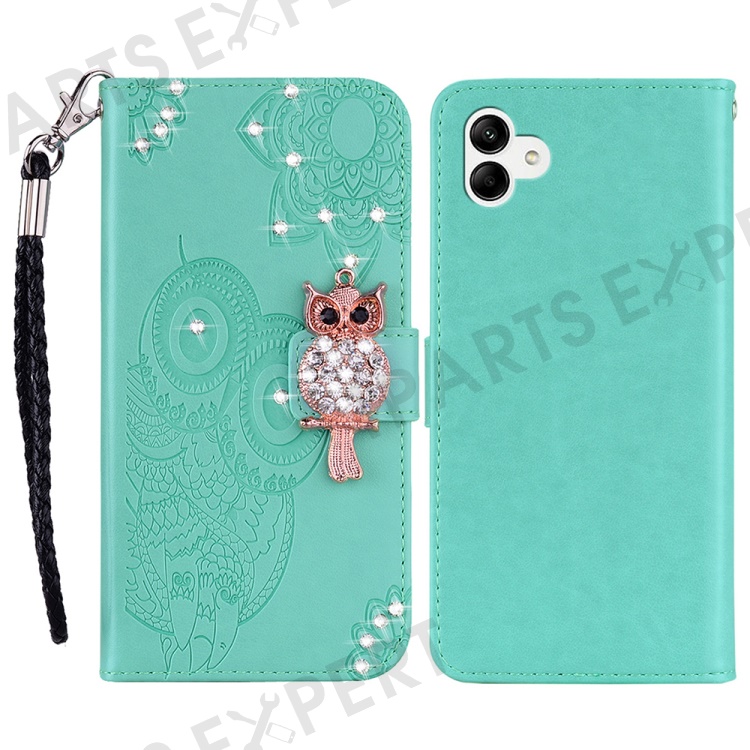 For Samsung Galaxy A06 4G Wallet Case Owl Flower Imprinted Rhinestone Leather Cover - Cyan