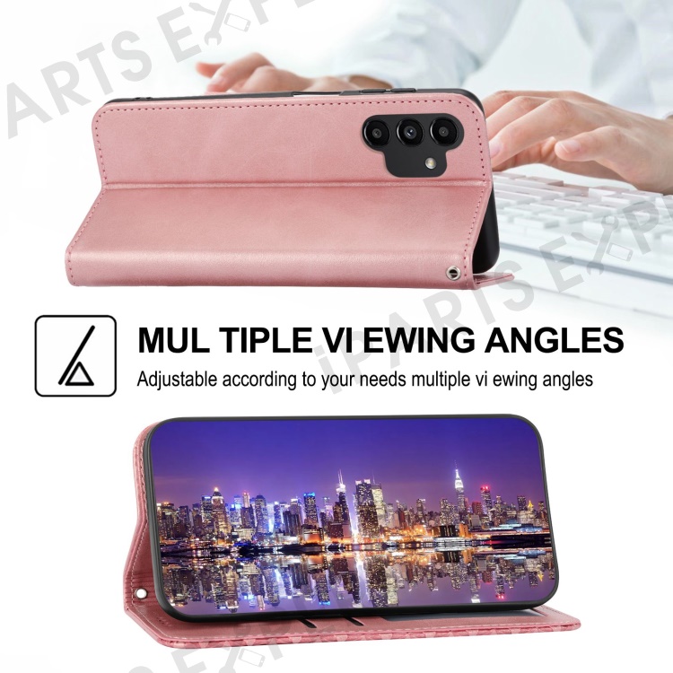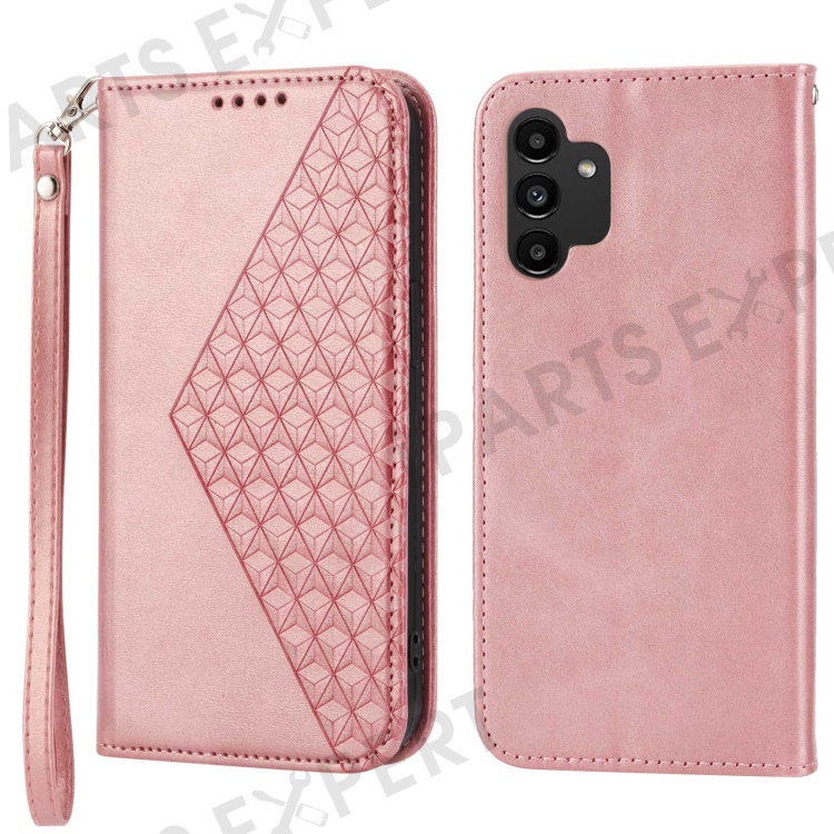For Samsung Galaxy A13 4G / A13 5G / A04s 4G (164.7mm) Leather Wallet Case Imprint Rhombus Calf Texture Phone Stand Cover with Strap - Rose Gold