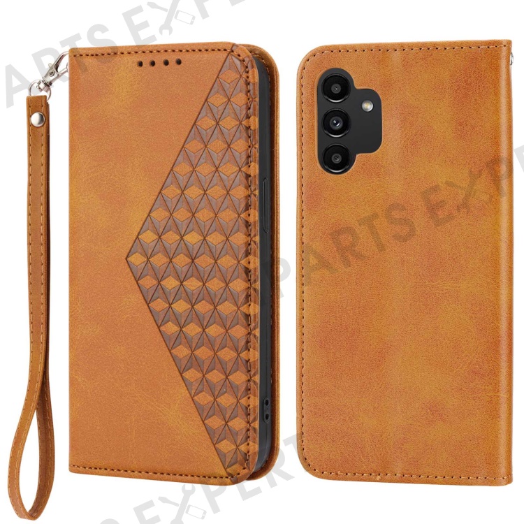 For Samsung Galaxy A13 4G / A13 5G / A04s 4G (164.7mm) Leather Wallet Case Imprint Rhombus Calf Texture Phone Stand Cover with Strap - Yellow