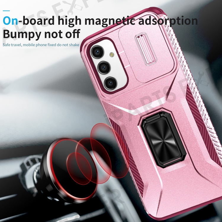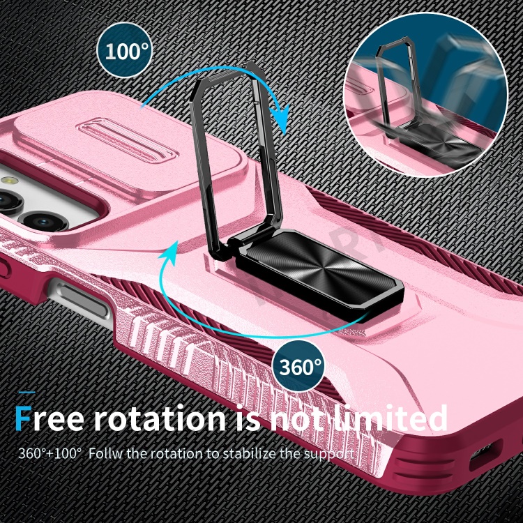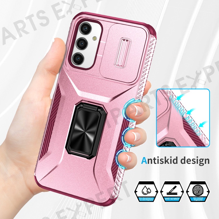 For Samsung Galaxy A14 4G / 5G Case Slide Lens Lid PC+TPU Phone Cover Kickstand Anti-drop Shell - Pink / Rose