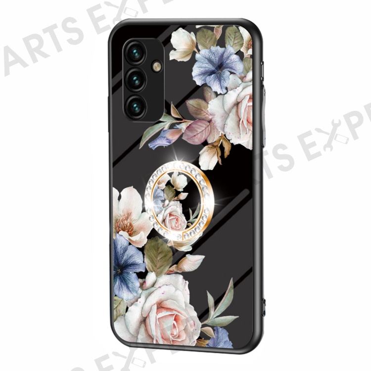 For Samsung Galaxy A14 5G / A14 4G Flower Pattern Phone Cover Tempered Glass+PC+TPU Case with Kickstand - Black Flower Bush