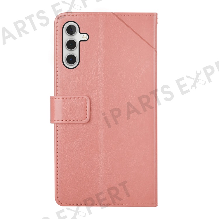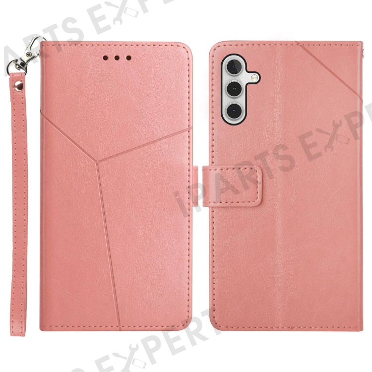 For Samsung Galaxy A14 5G / A14 4G HT01 PU Leather Imprinted Y-Shaped Lines Phone Case Anti-drop Wallet Stand Cover with Strap - Pink