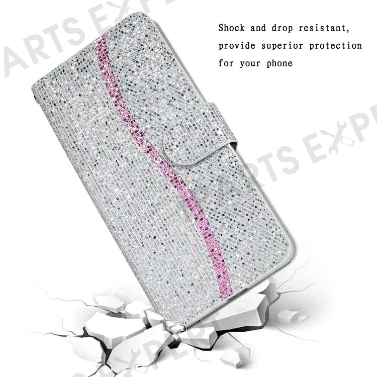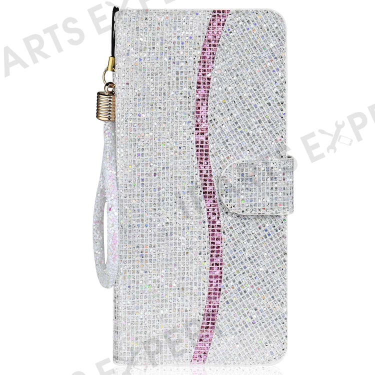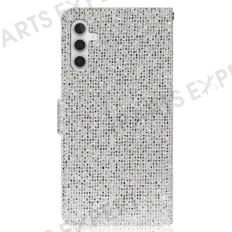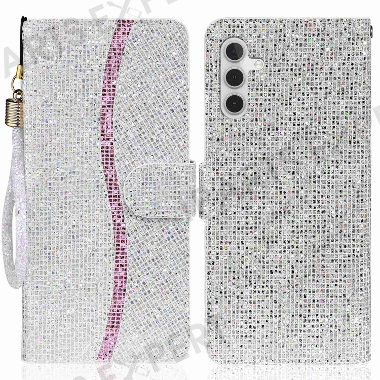 For Samsung Galaxy A14 5G / 4G Phone Case Glittery Powder PU Leather Foldable Stand Wallet Style Flip Shell with Wrist Strap - Silver