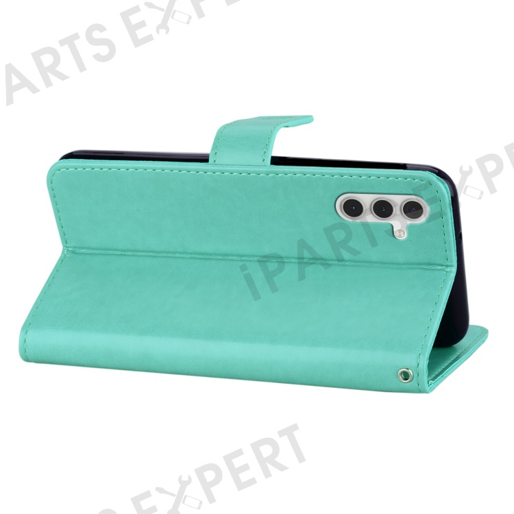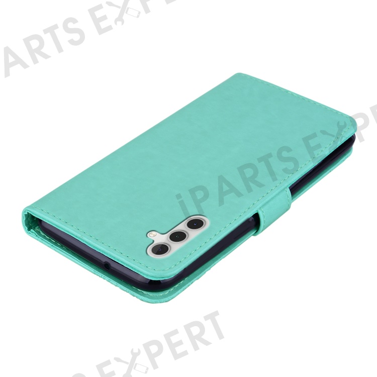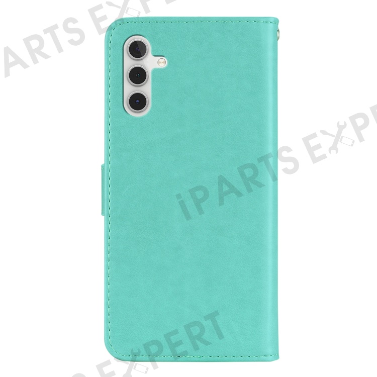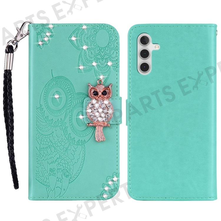For Samsung Galaxy A14 5G / A14 4G Rhinestone Decor Scratch Resistant Phone Cover, Imprinting Owl Flower Pattern Stand Wallet Leather Case - Cyan