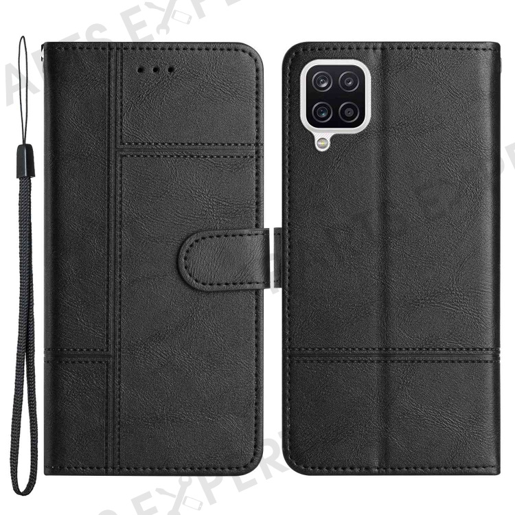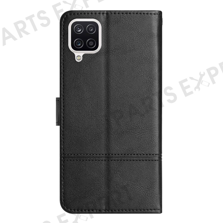 For Samsung Galaxy A22 4G (EU Version) Business Style Wallet Case Lines Imprinted PU Leather Folding Stand Magnetic Closure Protective Cover with Strap - Black