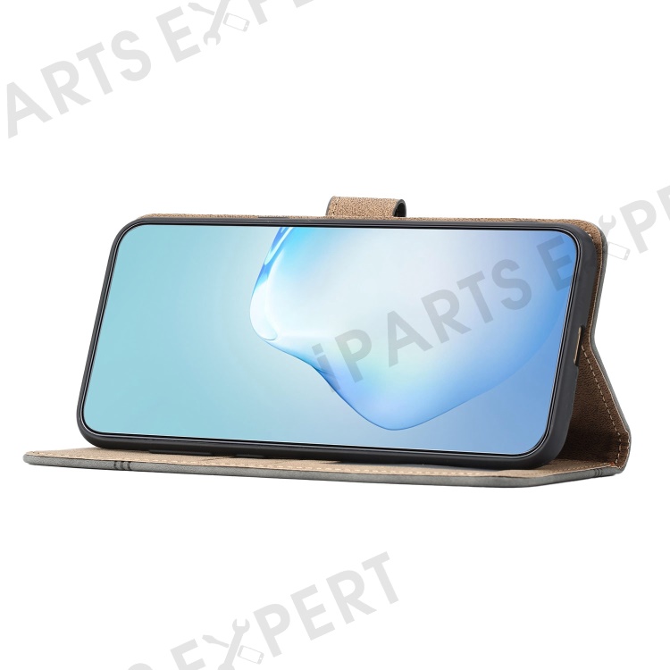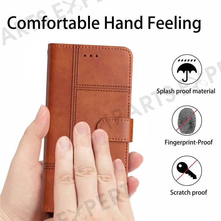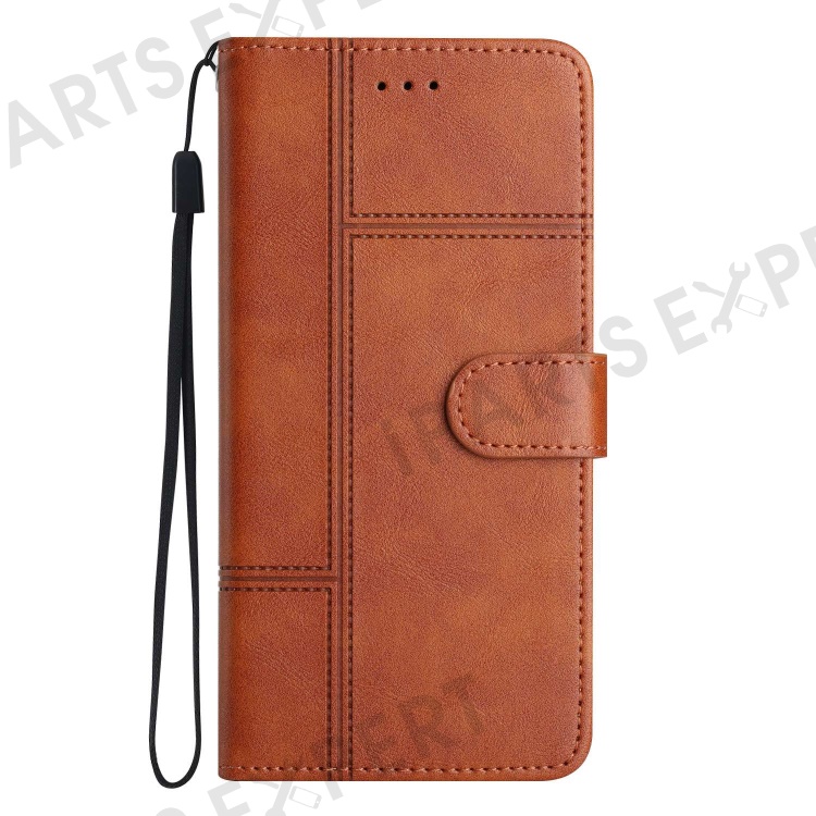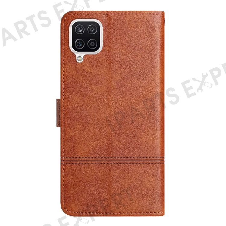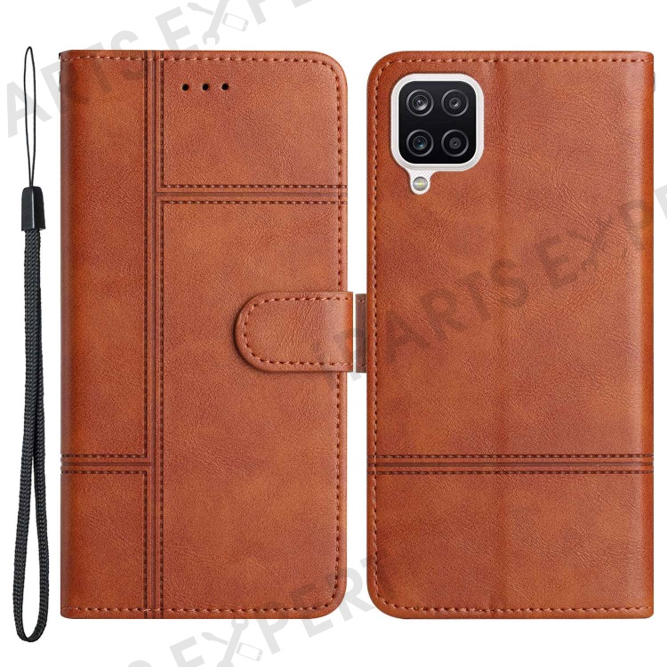 For Samsung Galaxy A22 4G (EU Version) Business Style Wallet Case Lines Imprinted PU Leather Folding Stand Magnetic Closure Protective Cover with Strap - Brown