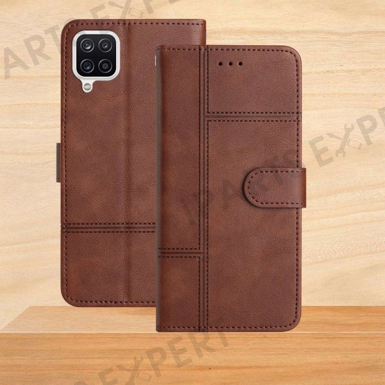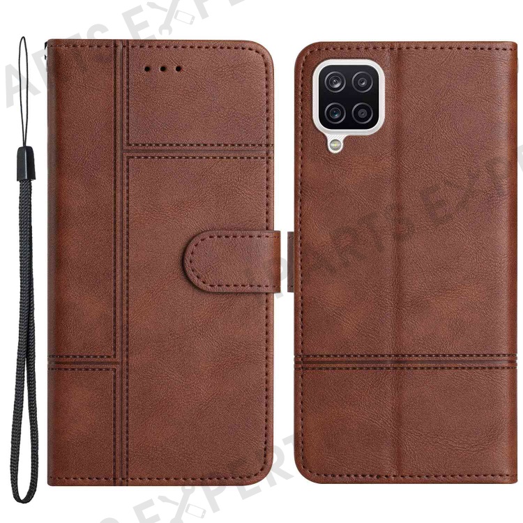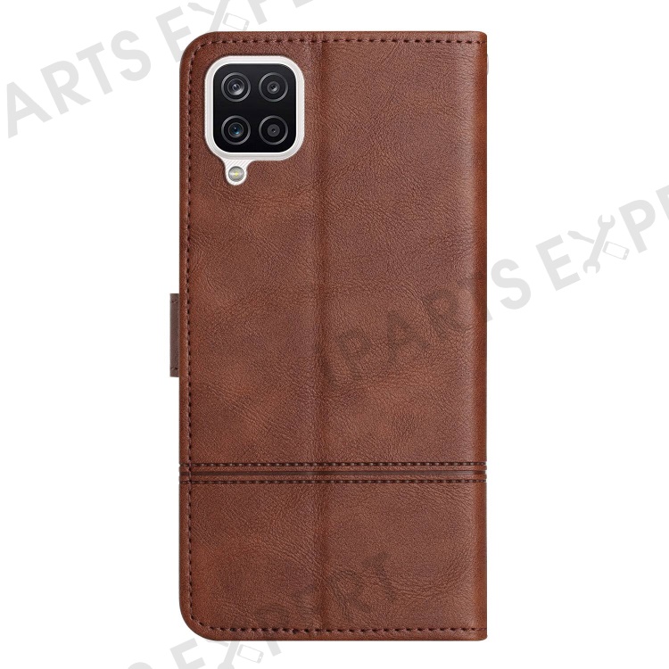For Samsung Galaxy A22 4G (EU Version) Business Style Wallet Case Lines Imprinted PU Leather Folding Stand Magnetic Closure Protective Cover with Strap - Coffee