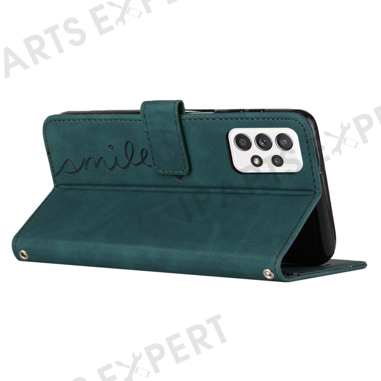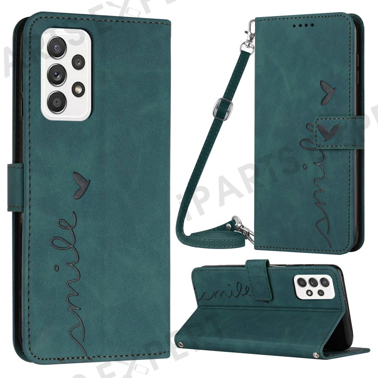 For Samsung Galaxy A23 4G / A23 5G (Global Version) / F23 5G / M23 5G / M13 4G Flip PU Leather Phone Cover Skin-touch Feeling Imprinted Heart Shape Wallet Stand Case with Shoulder Strap - Green
