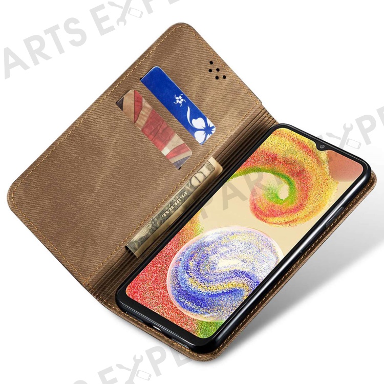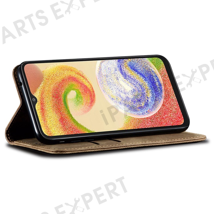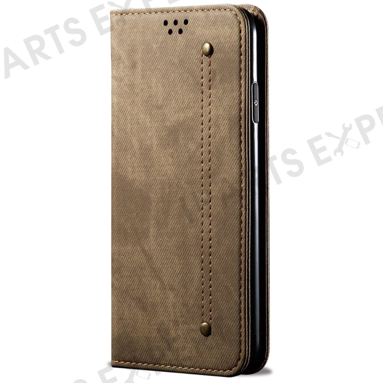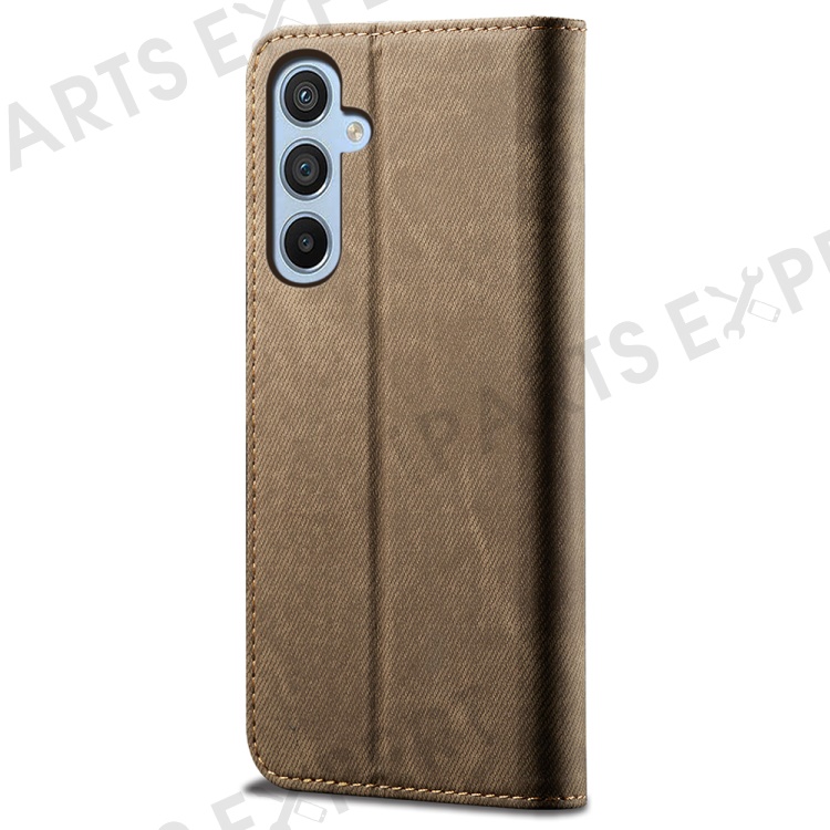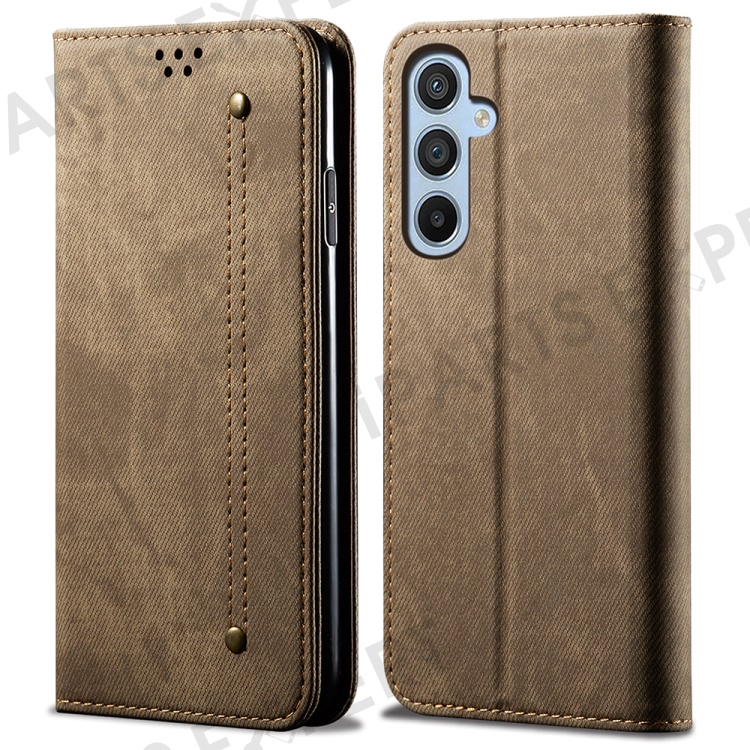 For Samsung Galaxy A25 5G (Global) (161.0 x 76.5 x 8.3mm) Wallet PU Leather Shockproof Cover Jeans Cloth Texture Phone Stand Case - Khaki