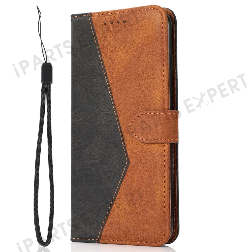 For Samsung Galaxy A26 5G Cover Color Splicing Wallet Stand Leather Phone Case with Wrist Strap - Black Brown