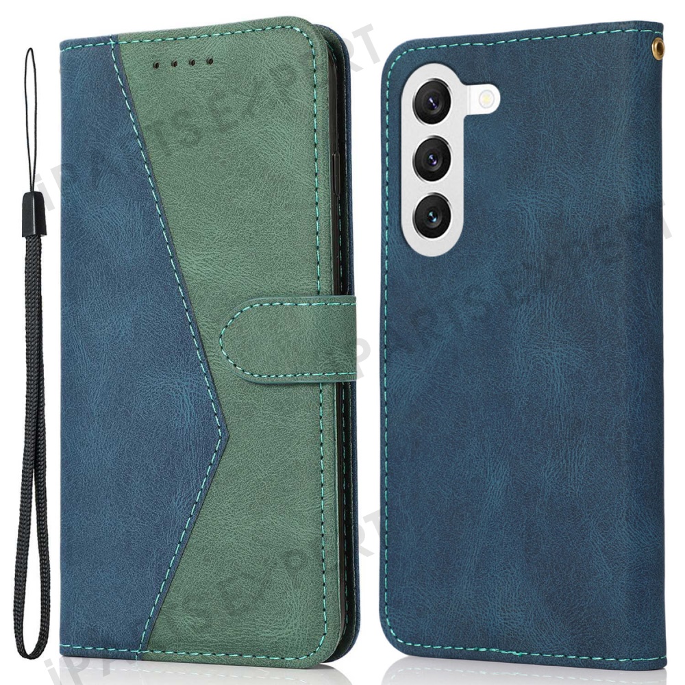 For Samsung Galaxy A26 5G Cover Color Splicing Wallet Stand Leather Phone Case with Wrist Strap - Blue Green