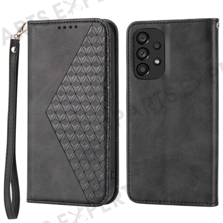 For Samsung Galaxy A33 5G Calf Texture PU Leather Magnetic Auto-absorbed Phone Case Imprinted Rhombus Pattern Wallet Stand Cover with Strap - Black