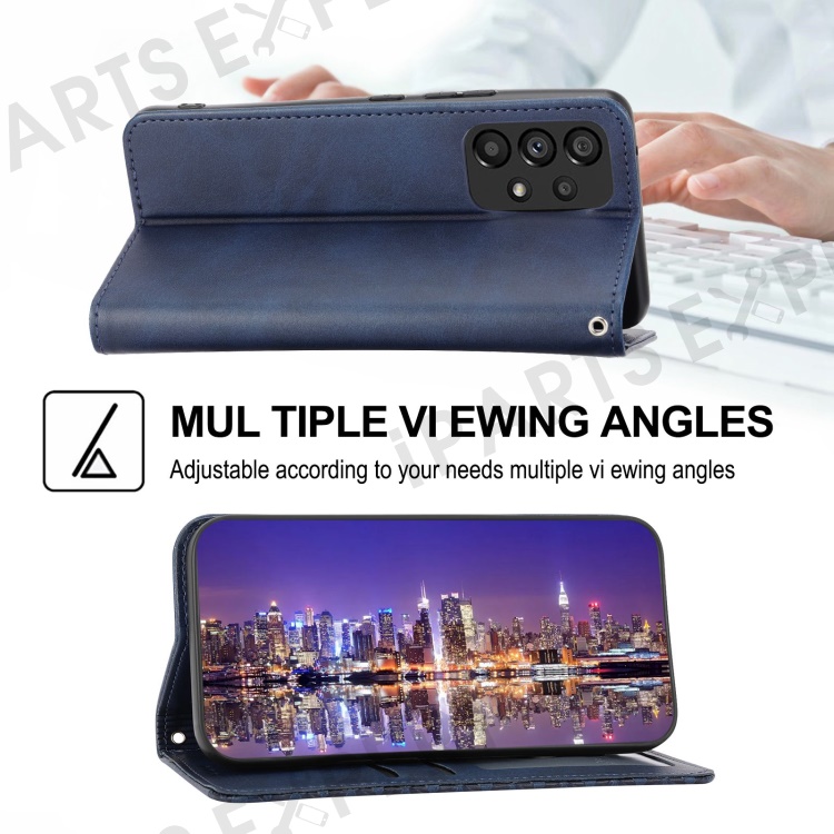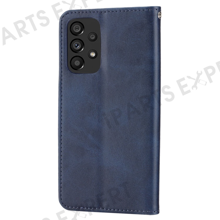 For Samsung Galaxy A33 5G Calf Texture PU Leather Magnetic Auto-absorbed Phone Case Imprinted Rhombus Pattern Wallet Stand Cover with Strap - Blue