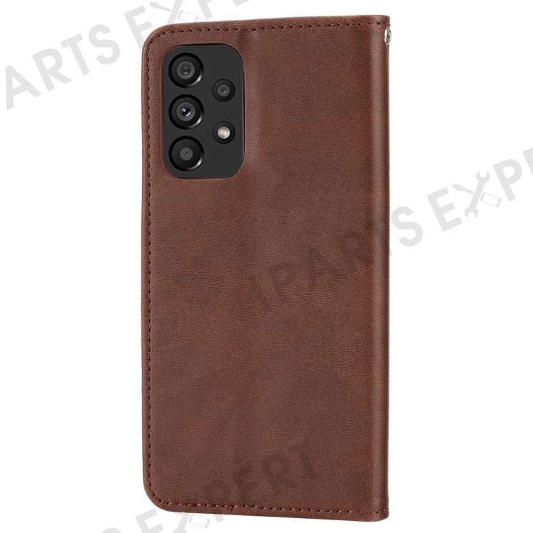 For Samsung Galaxy A33 5G Calf Texture PU Leather Magnetic Auto-absorbed Phone Case Imprinted Rhombus Pattern Wallet Stand Cover with Strap - Brown