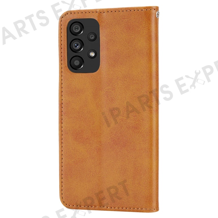 For Samsung Galaxy A33 5G Calf Texture PU Leather Magnetic Auto-absorbed Phone Case Imprinted Rhombus Pattern Wallet Stand Cover with Strap - Yellow