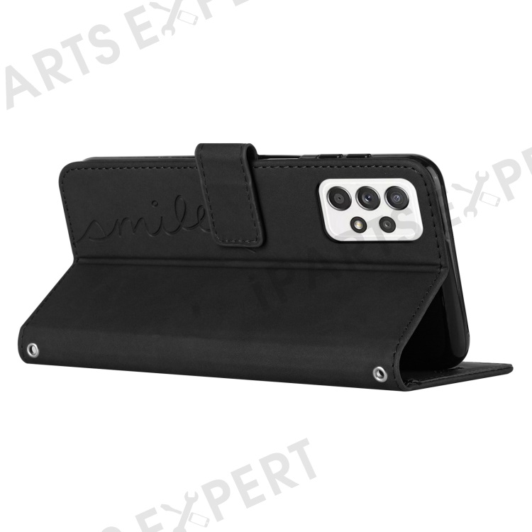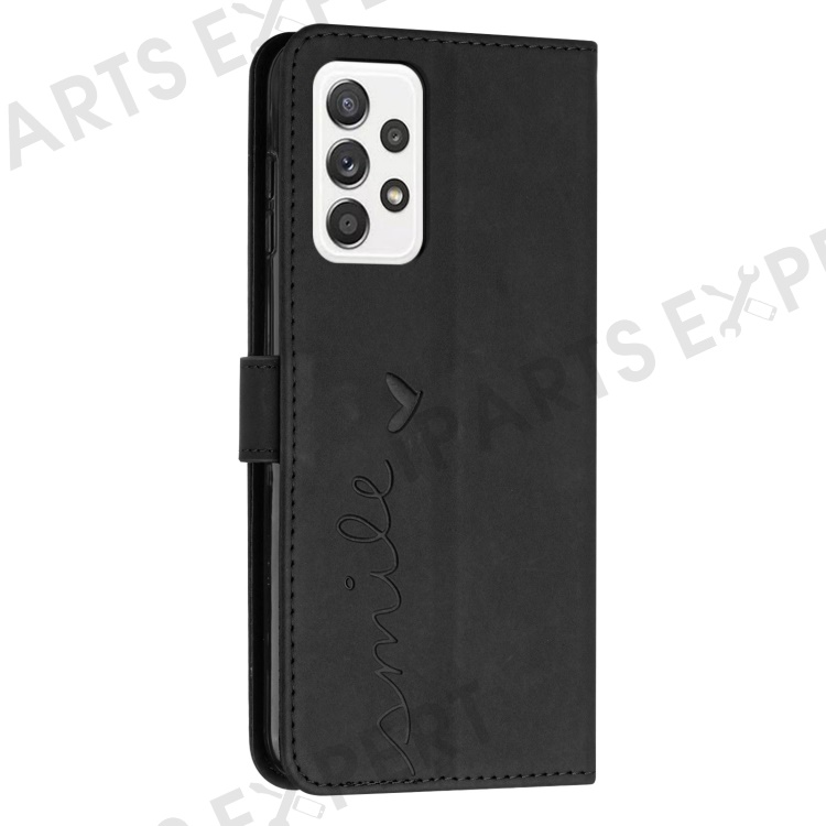 For Samsung Galaxy A33 5G Heart Shape Imprinted Wallet Stand Case Skin-touch Feeling PU Leather Phone Shockproof Cover with Shoulder Strap - Black