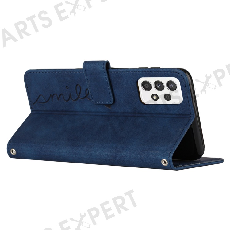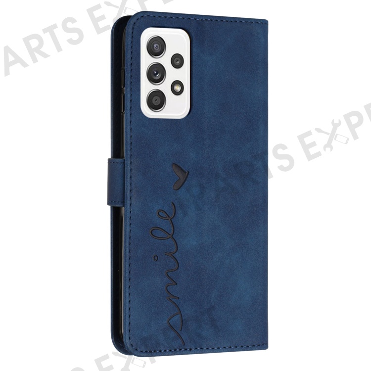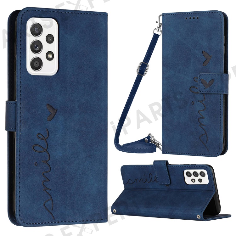 For Samsung Galaxy A33 5G Heart Shape Imprinted Wallet Stand Case Skin-touch Feeling PU Leather Phone Shockproof Cover with Shoulder Strap - Sapphire