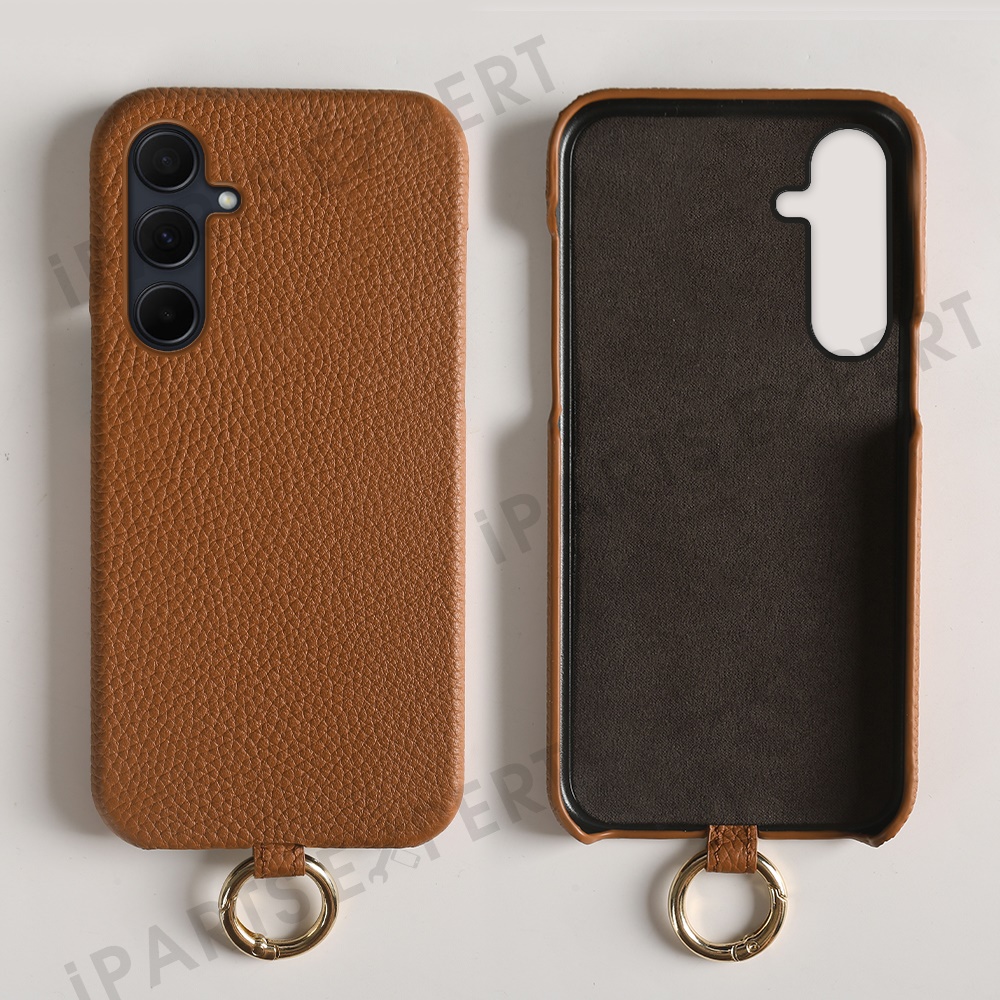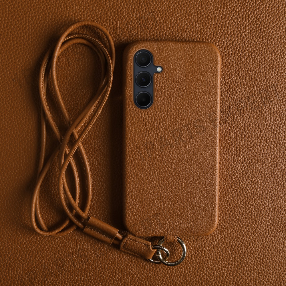 For Samsung Galaxy A35 5G Case with Lanyard Genuine Cow Leather PC Phone Back Cover - Brown