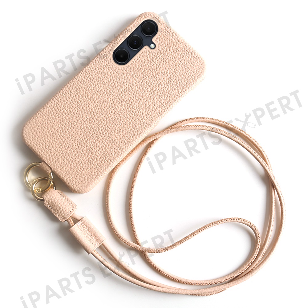 For Samsung Galaxy A35 5G Case with Lanyard Genuine Cow Leather PC Phone Back Cover - Pink