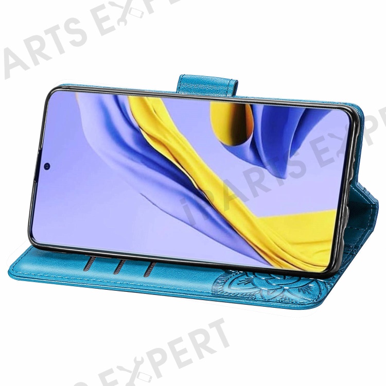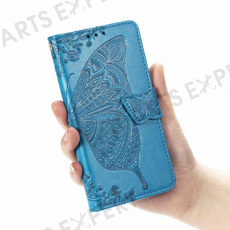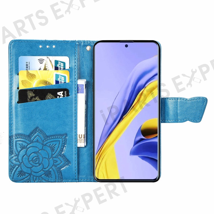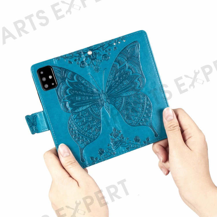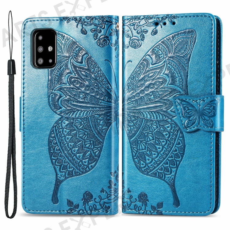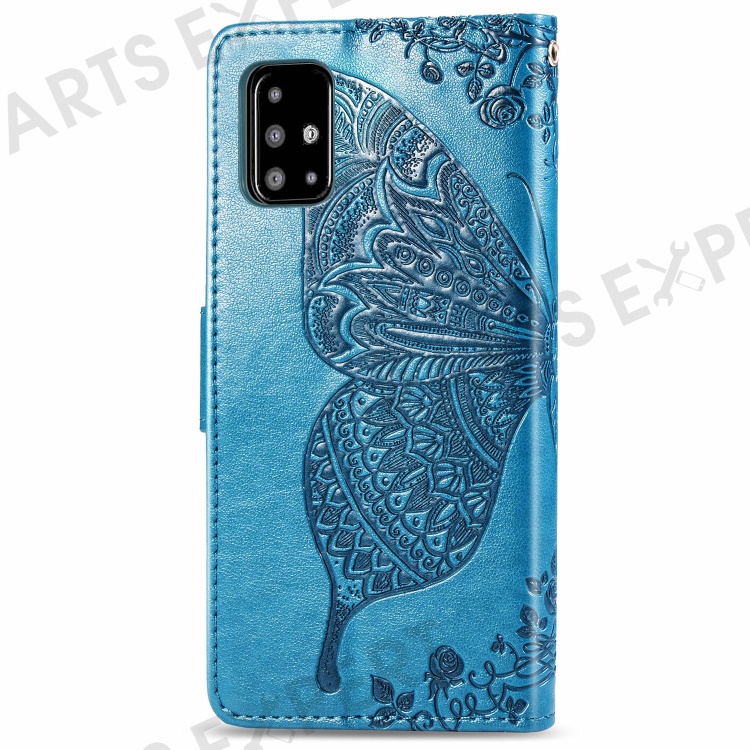 For Samsung Galaxy A51 4G SM-A515 Imprinted Butterfly Pattern Anti-scratch Phone Case PU Leather Stand Wallet Cover with Strap - Blue